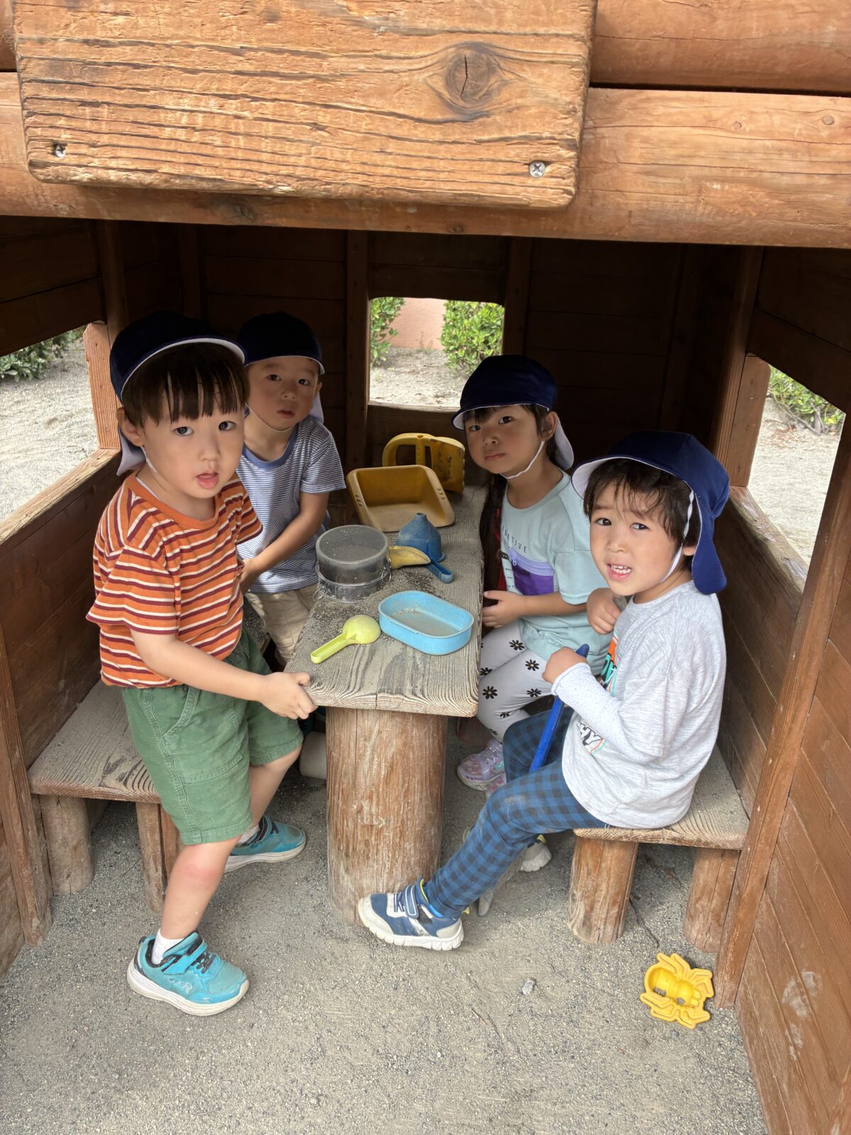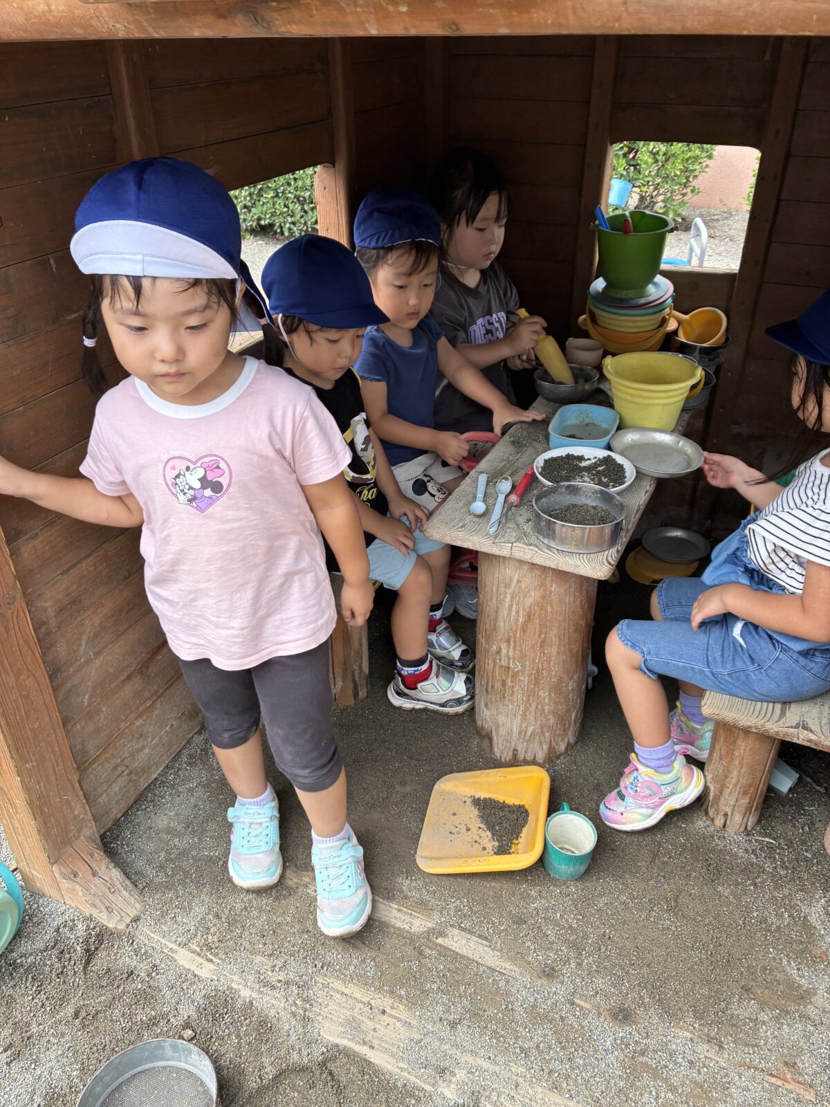秋の季節も感じられ、戸外遊びも十分に楽しんでいます。赤く色づいた木の実や葉っぱを集めてままごとにして遊んでいる姿も見られました。