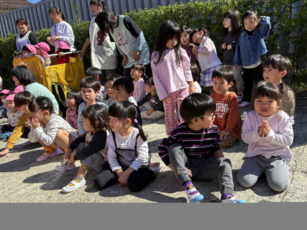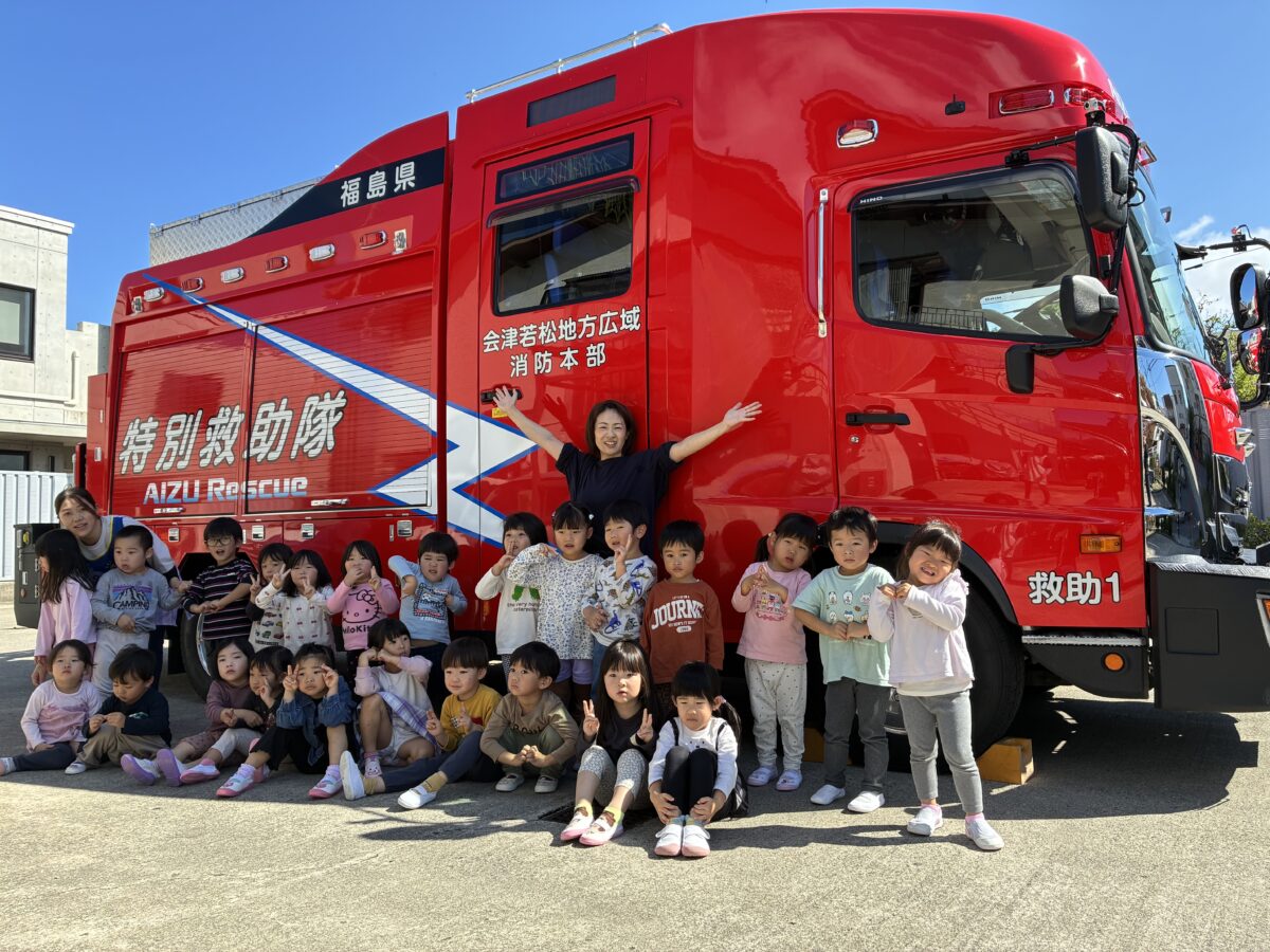 大きな消防車に大興奮の子ども達。みんなで一緒に写真を撮りました。