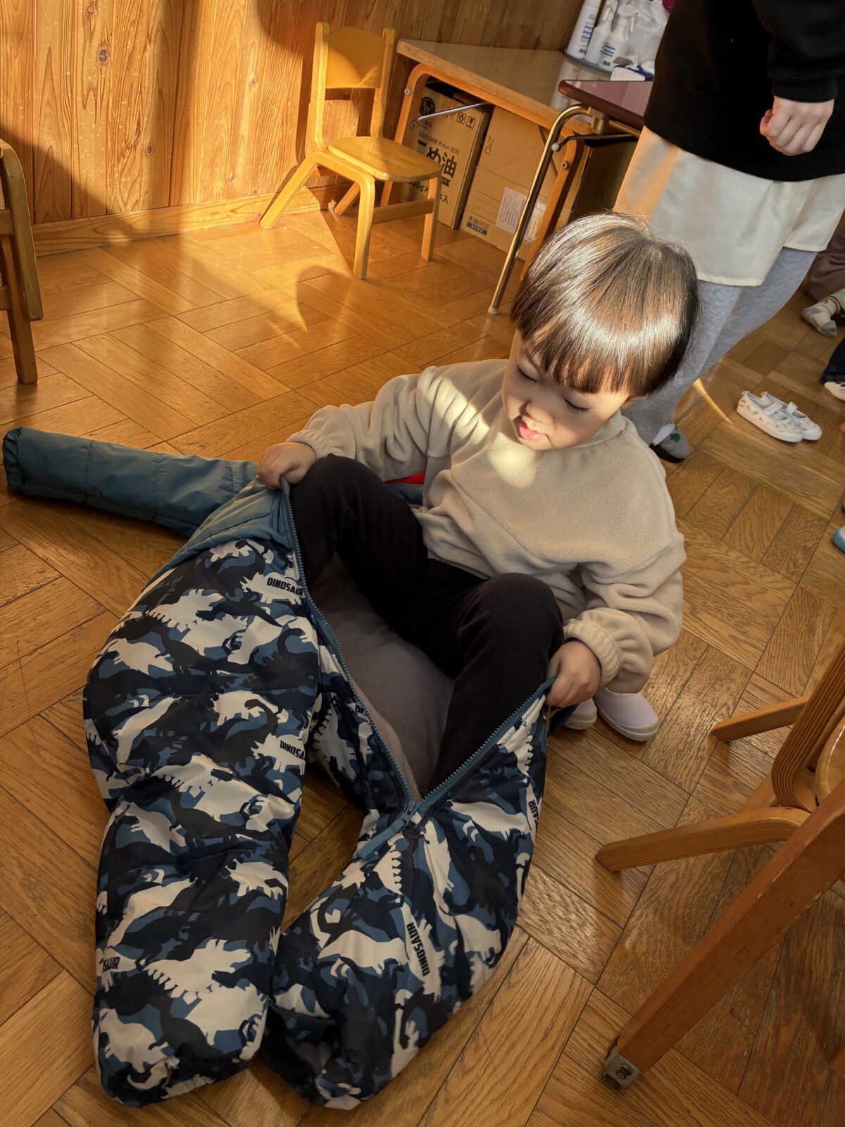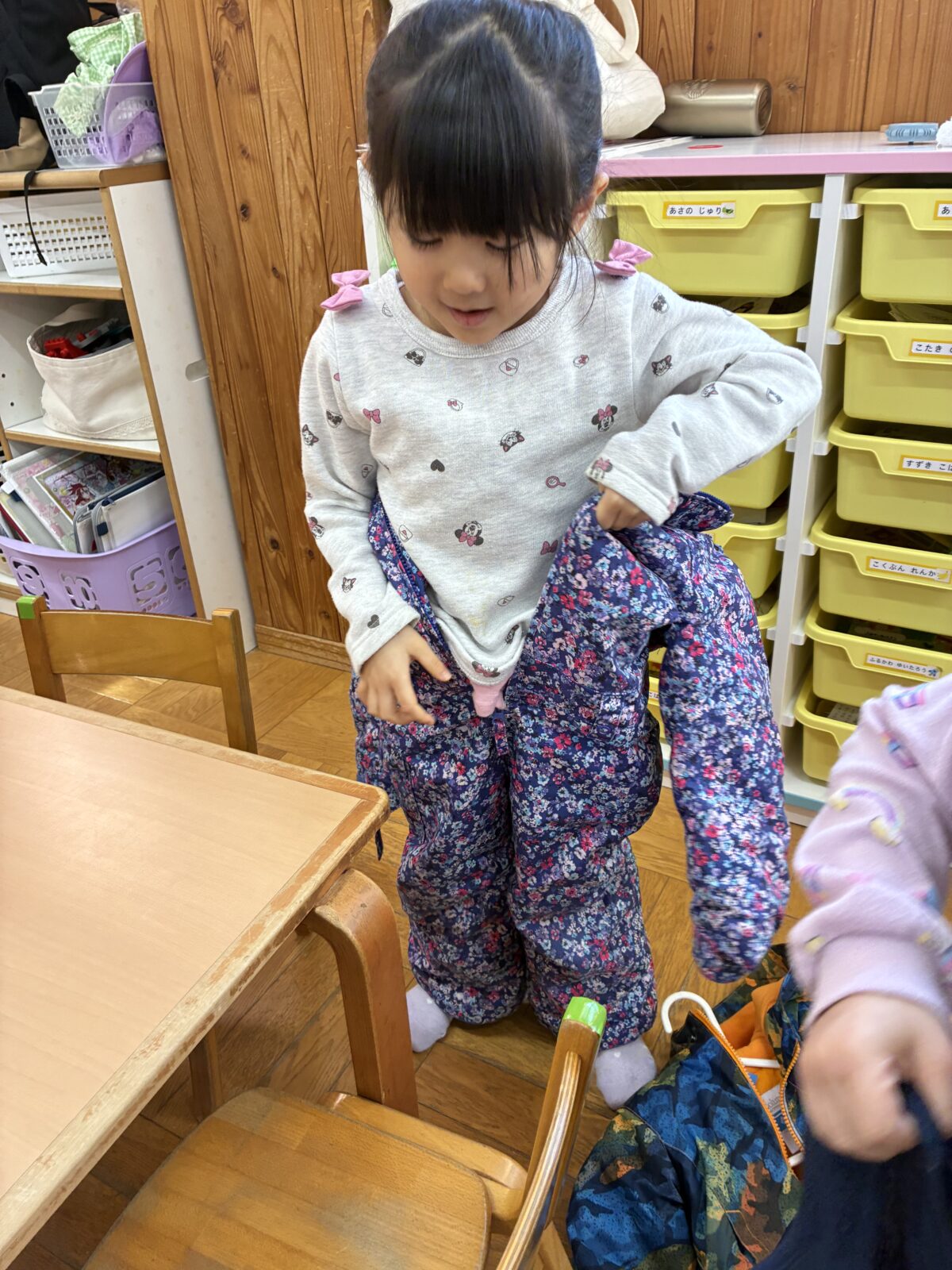 慣れないスキーウェアを自分で着て、帽子と手袋付けて準備完了!一面真っ白な雪に大喜びの子どもたちでした。