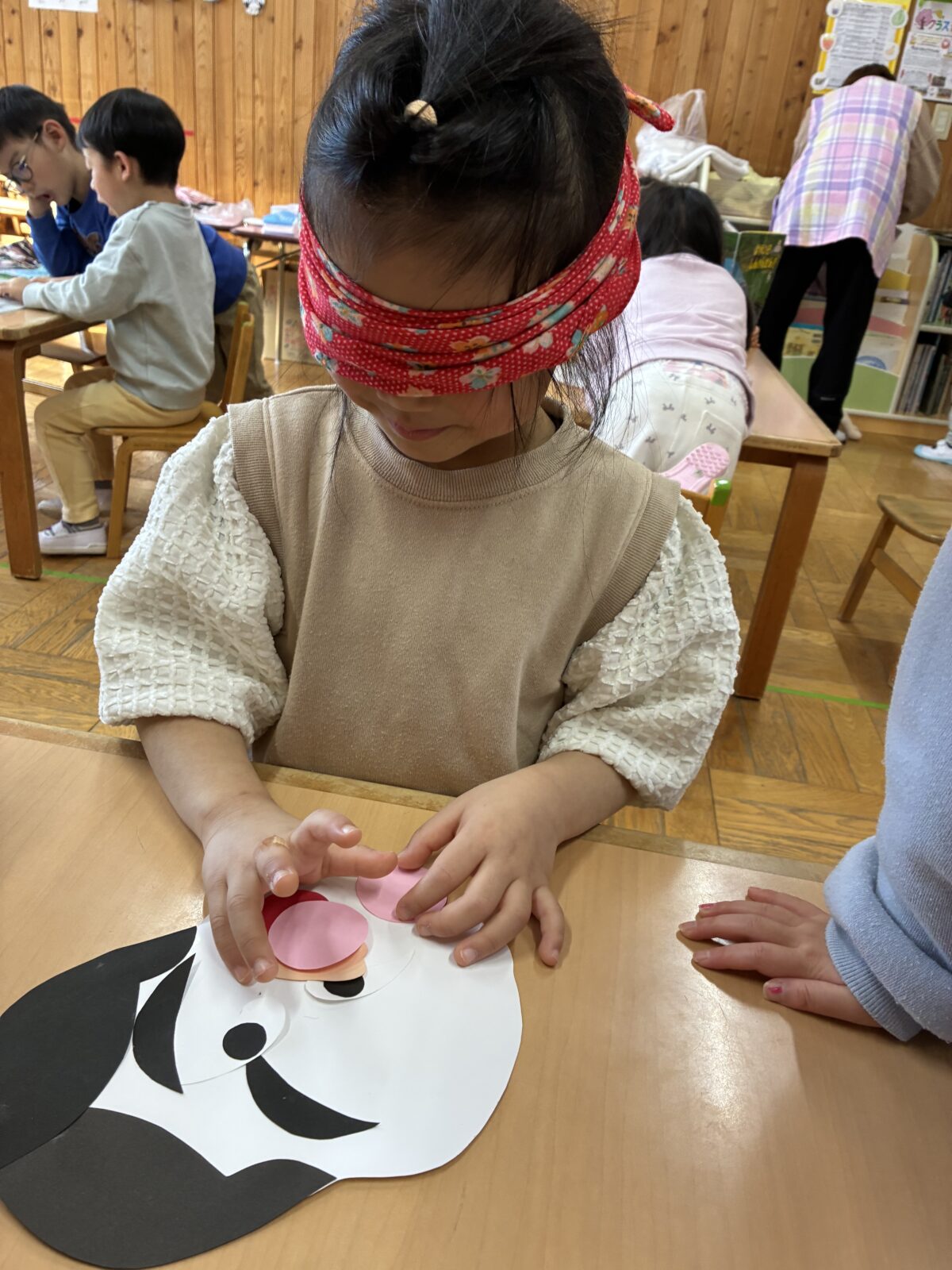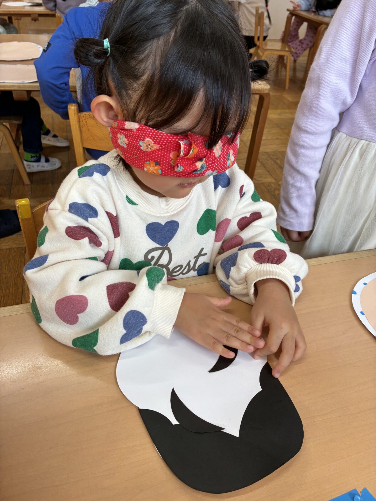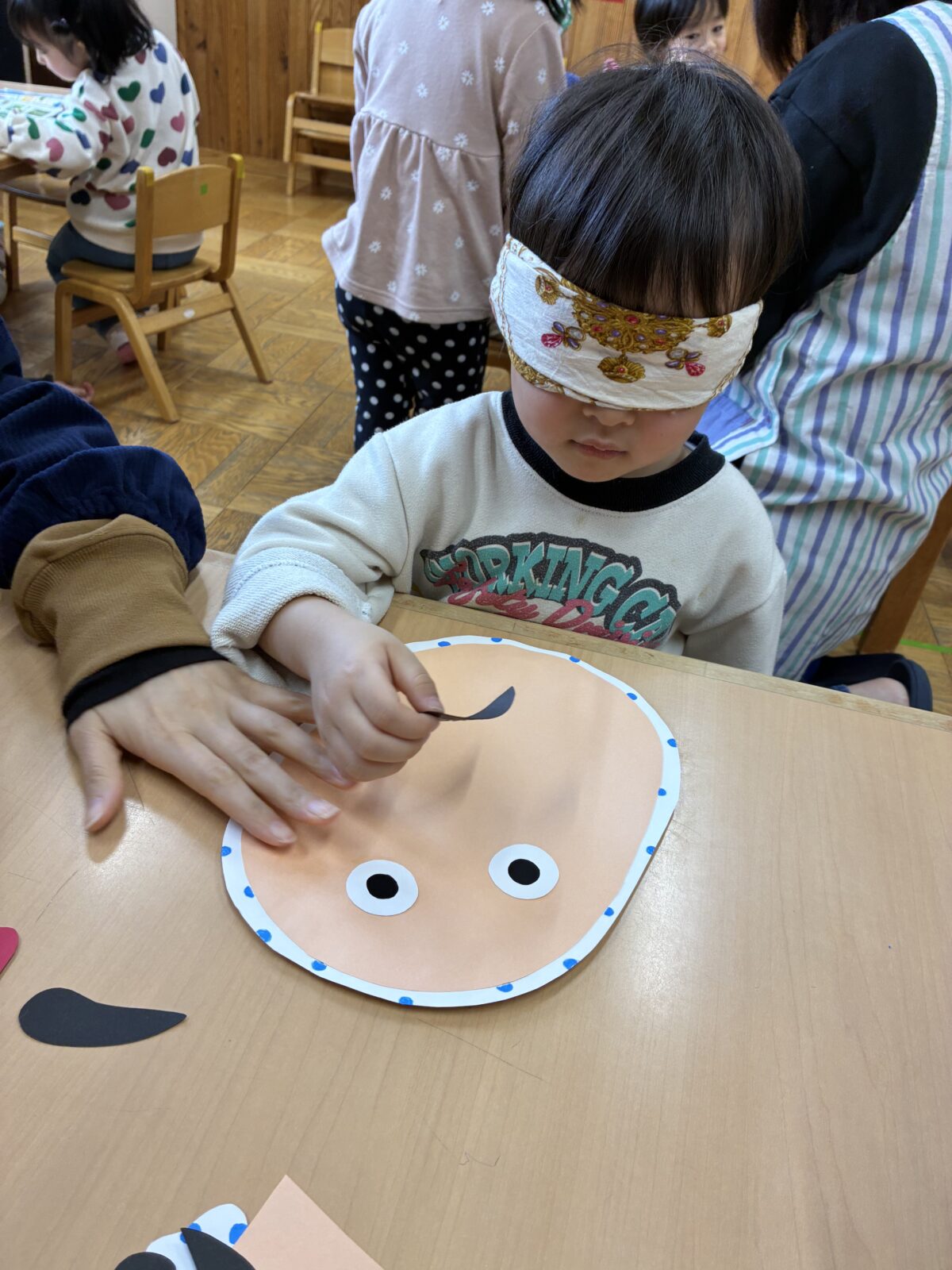 一月の製作では福笑いを楽しみました。目隠しをして友だちに目や鼻・口を渡してもらい、「どこだろう」と顔を探す子どもたち。