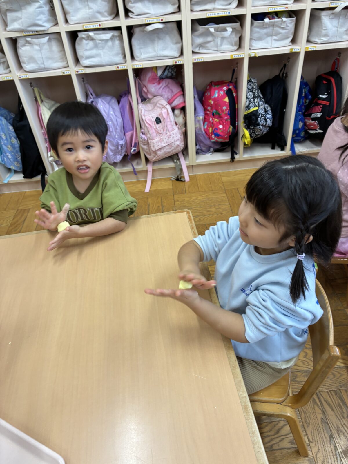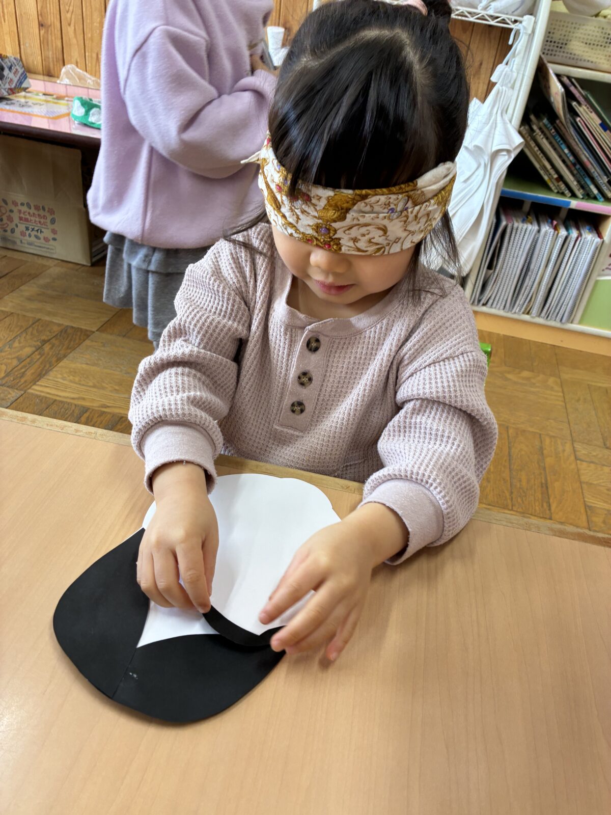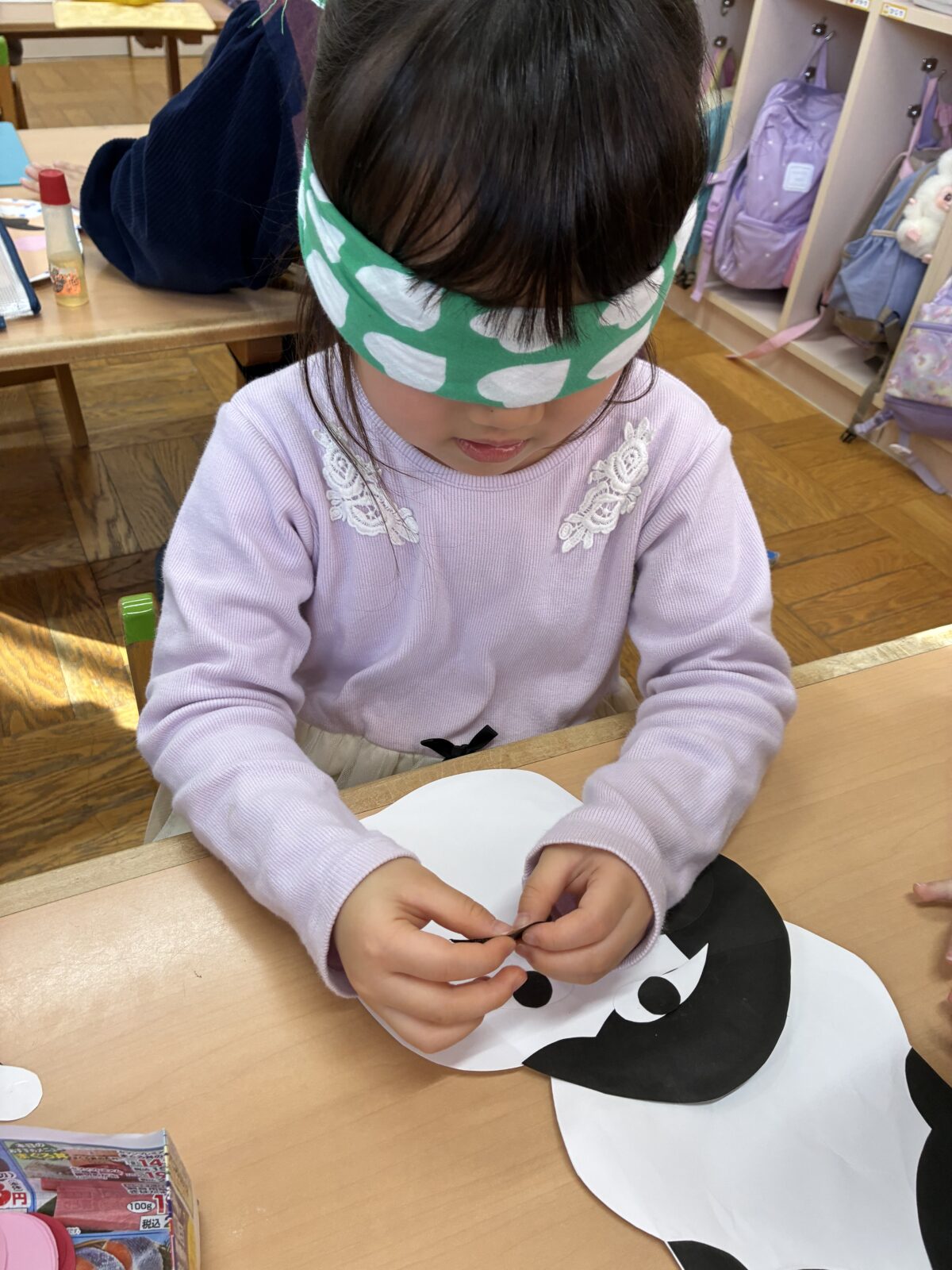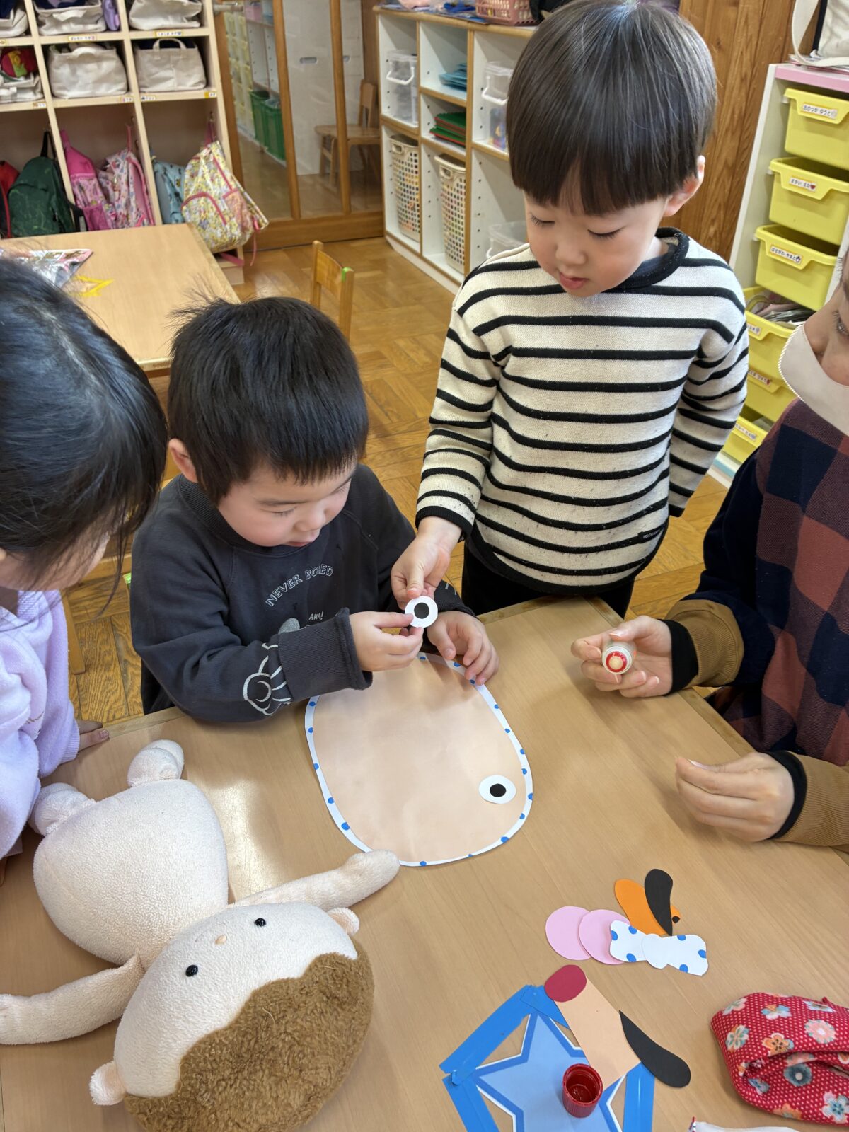一月の製作では福笑いを楽しみました。目隠しをして友だちに目や鼻・口を渡してもらい、「どこだろう」と顔を探す子どもたち。