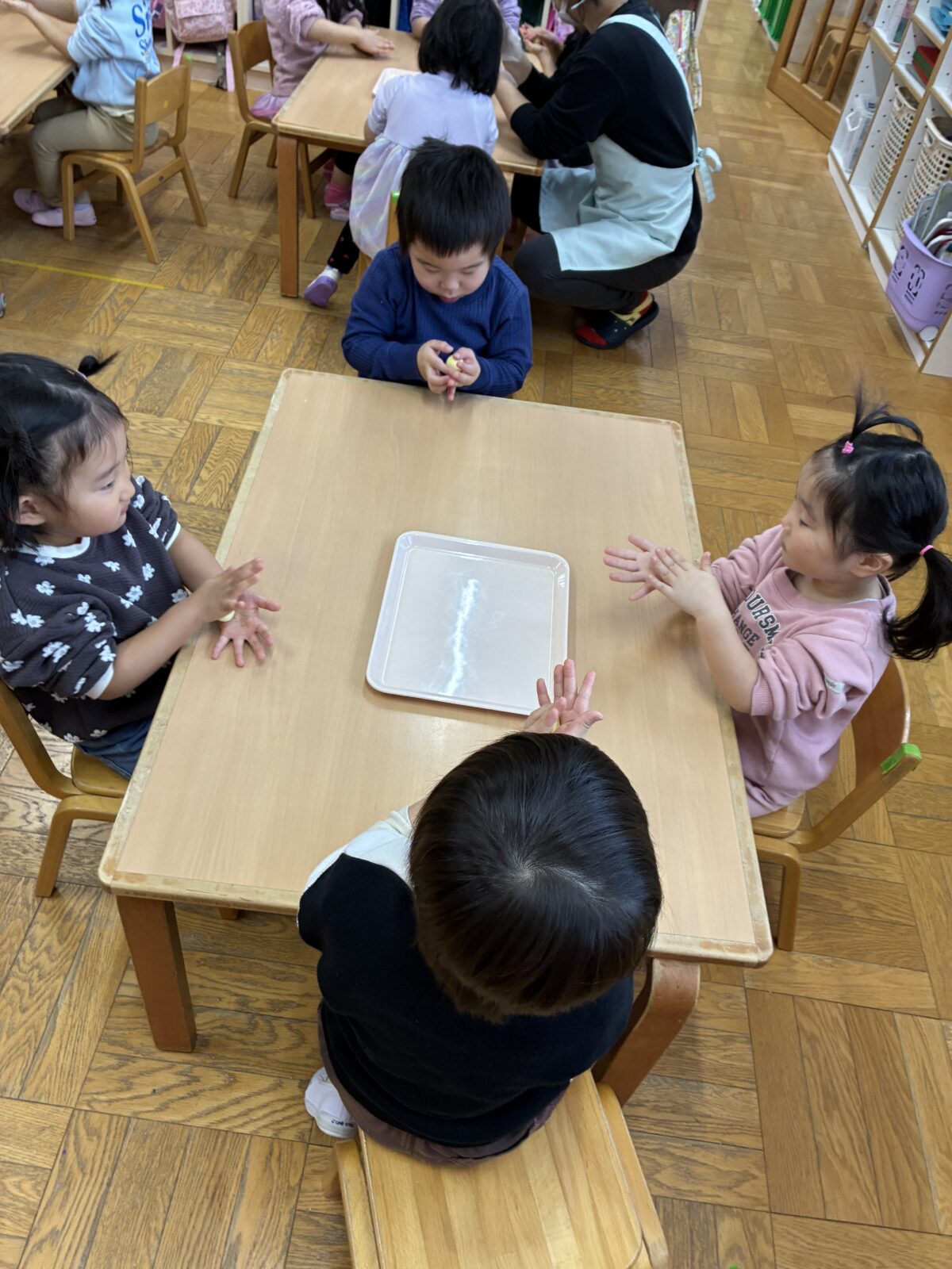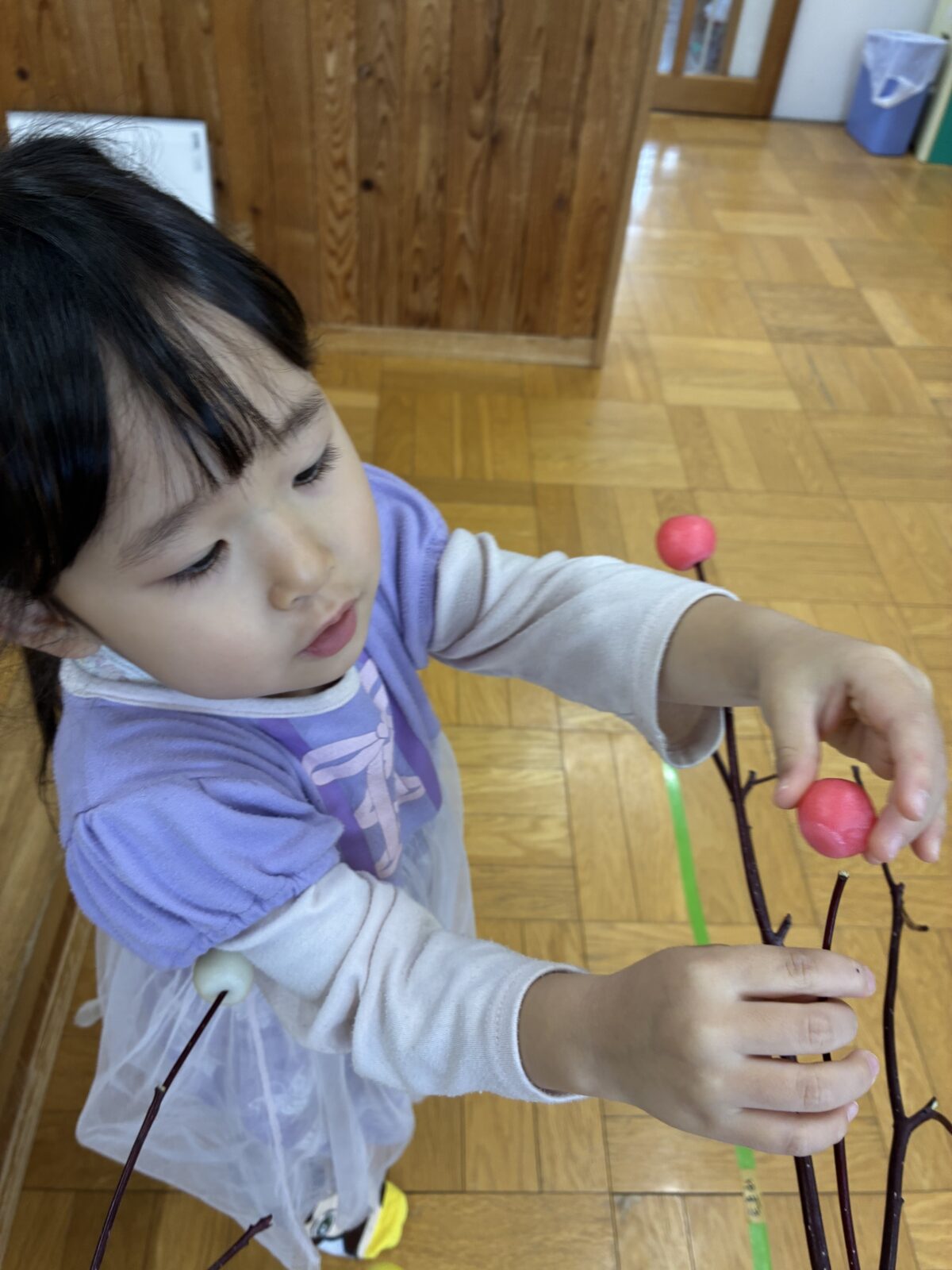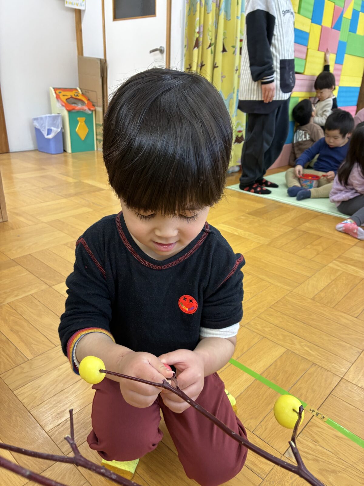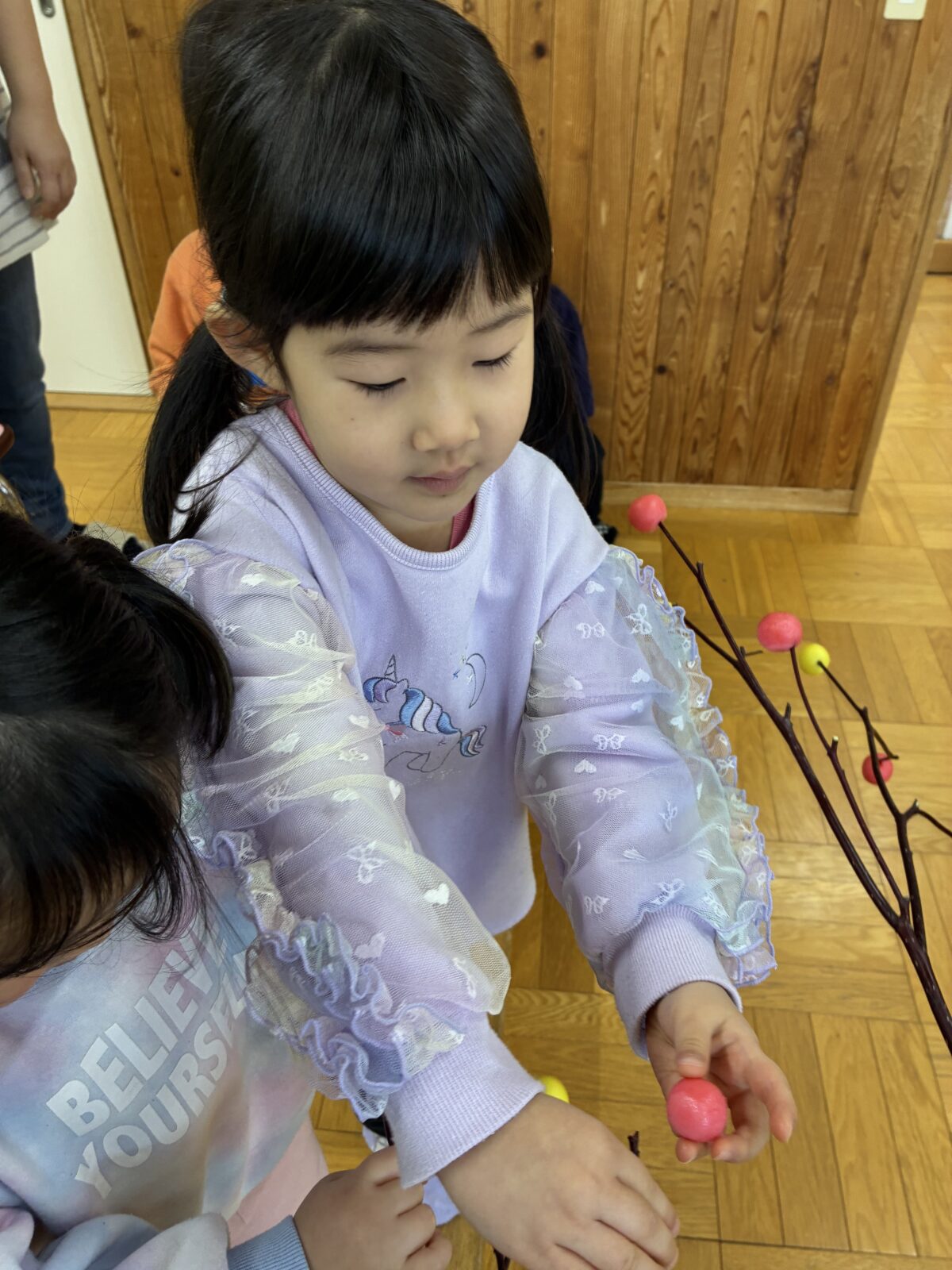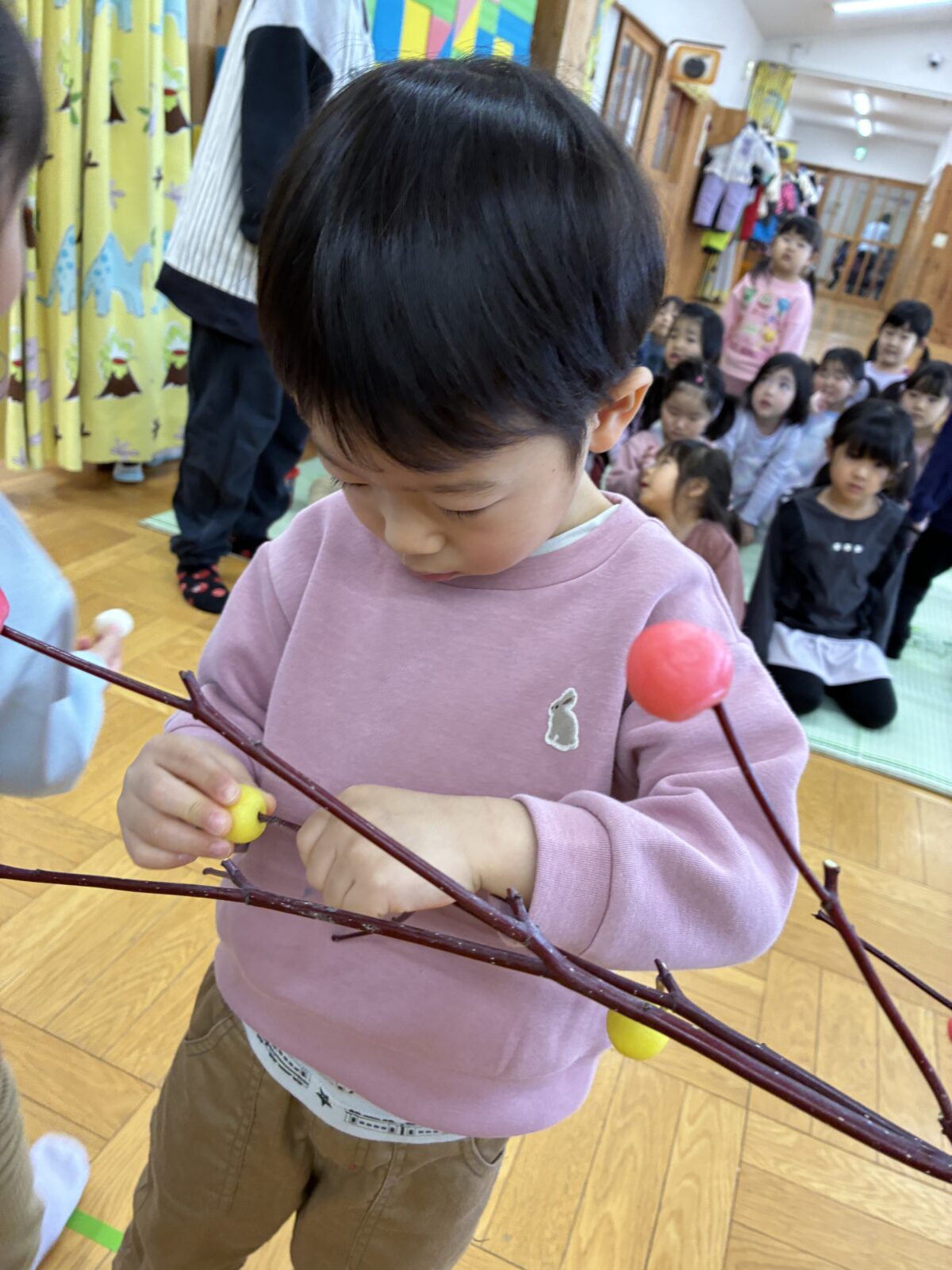レモン組は黄色の団子を丸め、願いを込めながら木に刺すことが出来ました。
