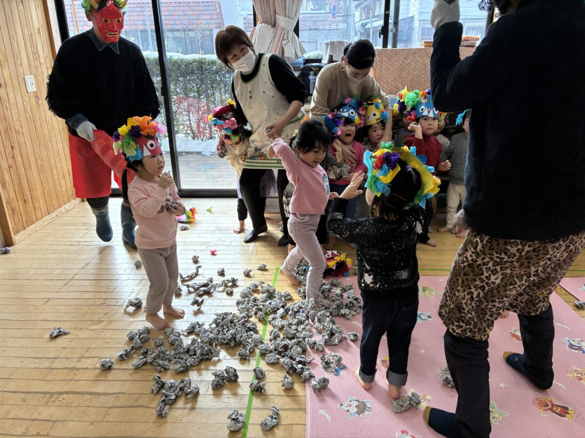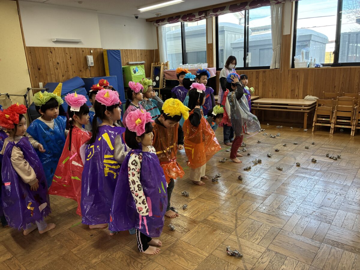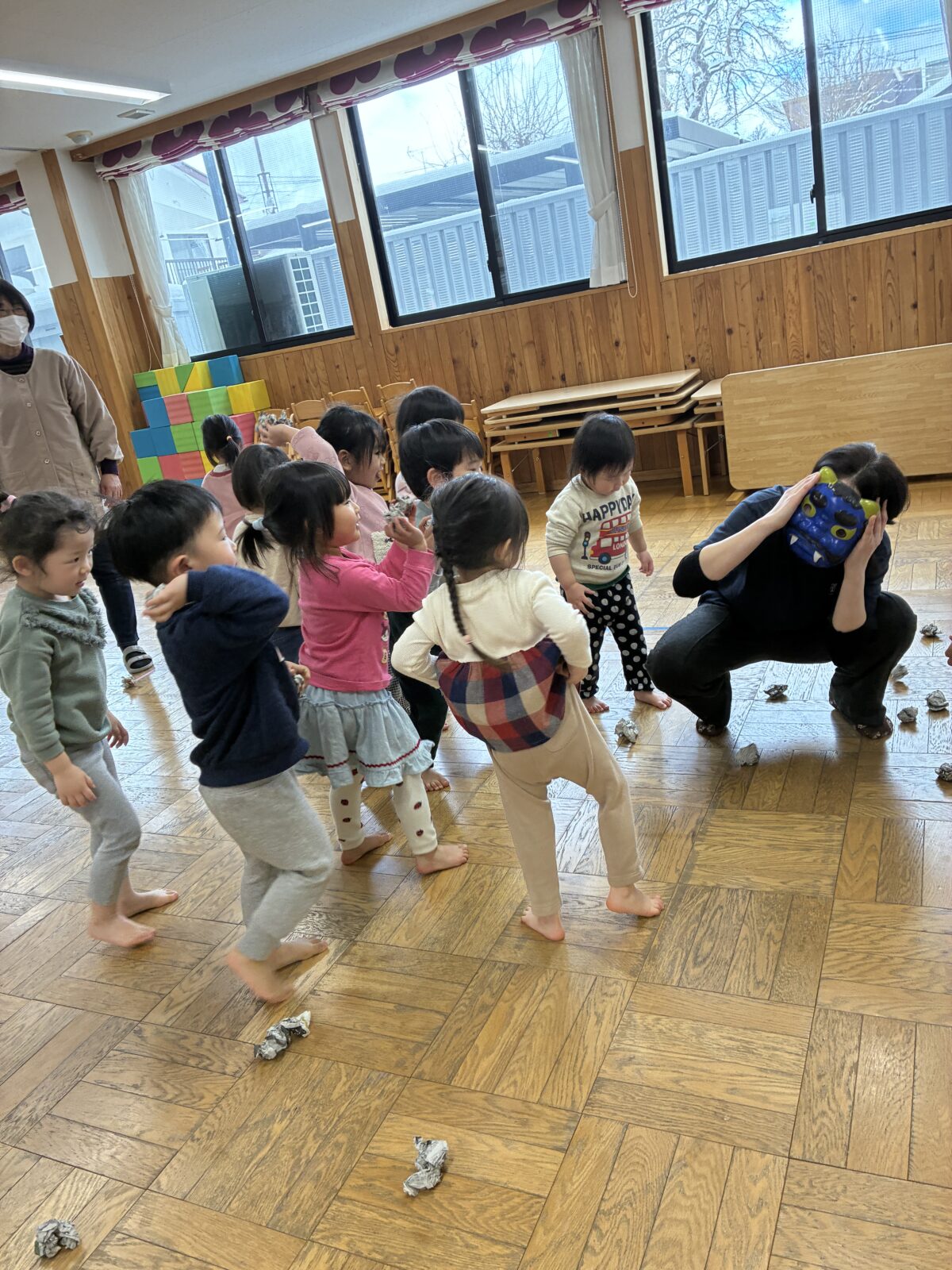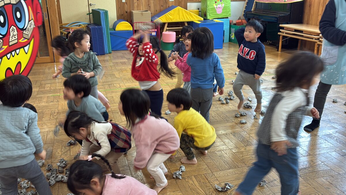2月3日の節分の日に豆まきをしました。事前に新聞紙を丸めて『まめ』を作成!職員や年長組の子どもたちが鬼役になり、練習をしました。