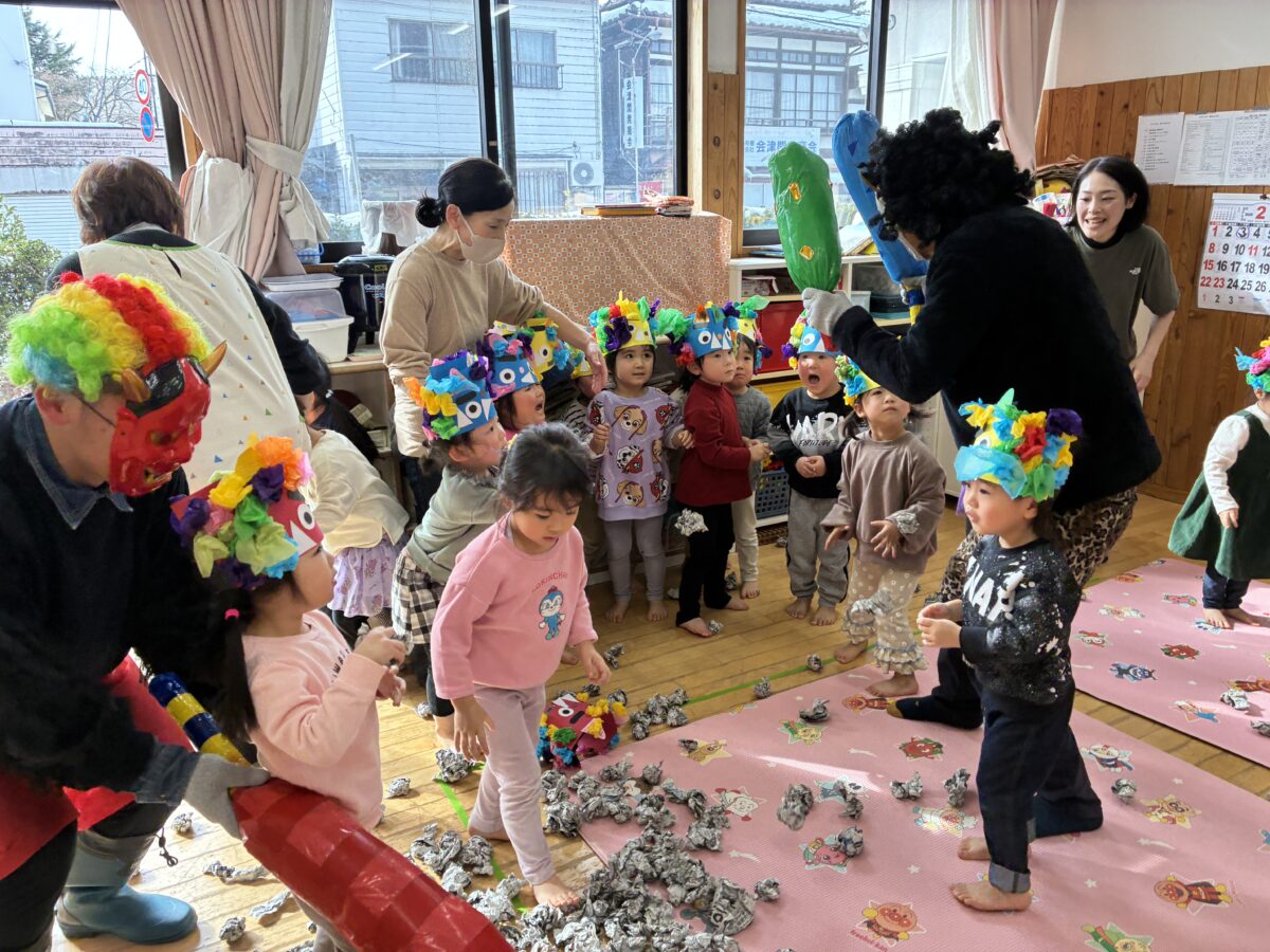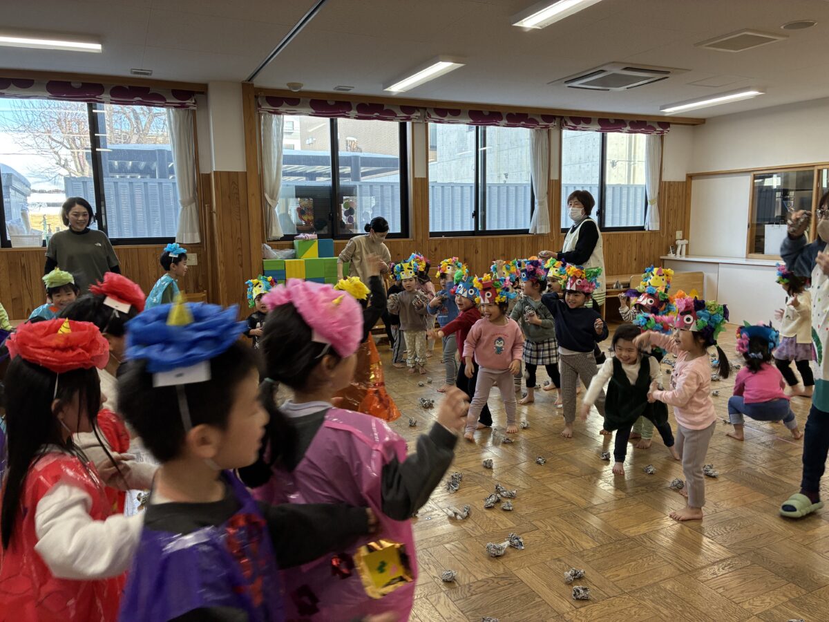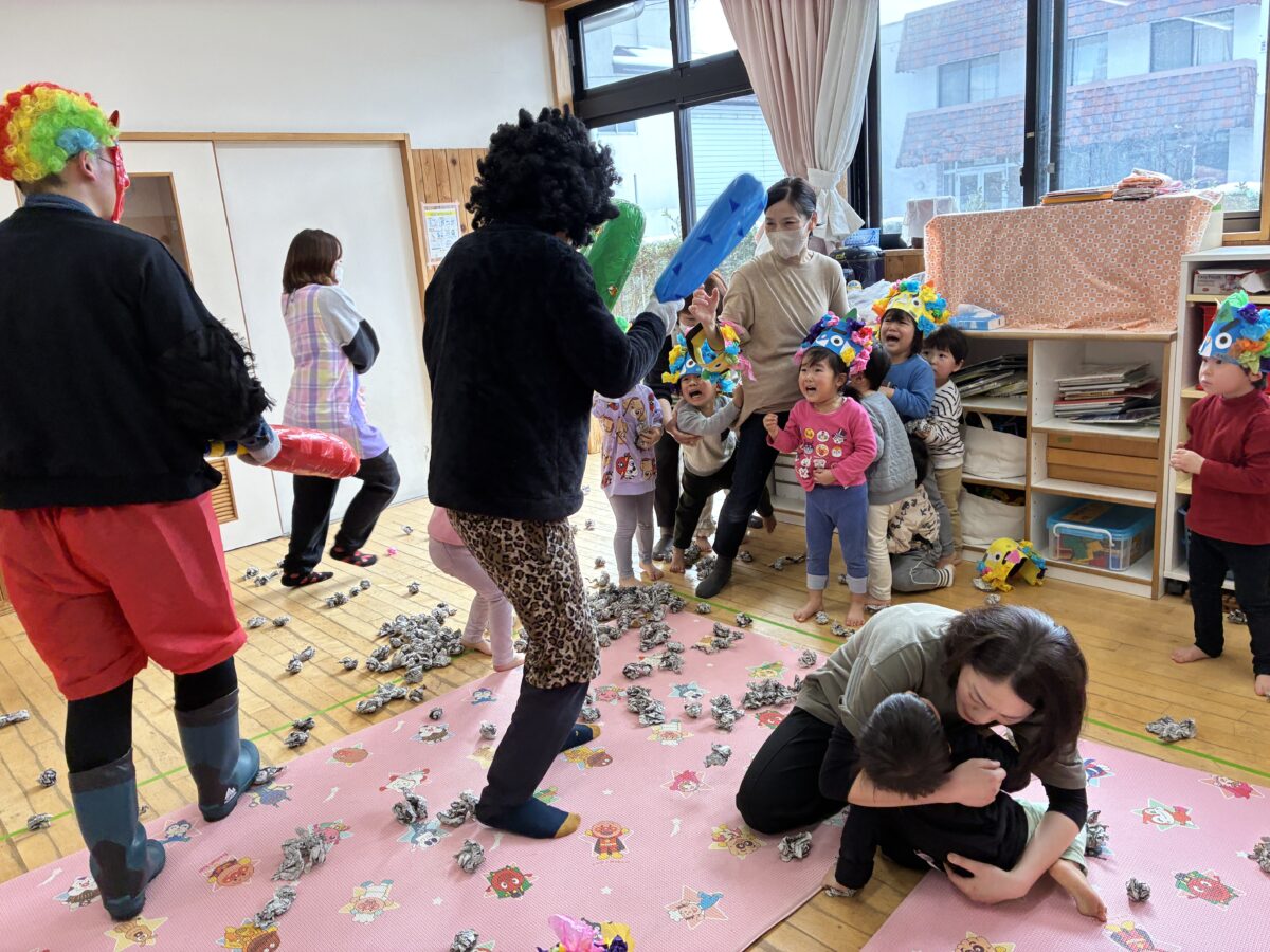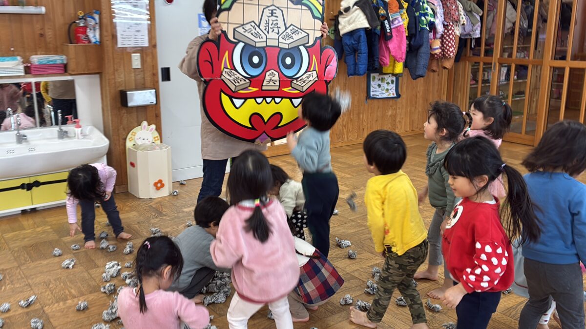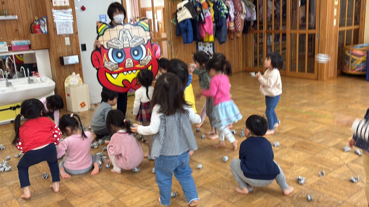 2月3日の節分の日に豆まきをしました。事前に新聞紙を丸めて『まめ』を作成!職員や年長組の子どもたちが鬼役になり、練習をしました。