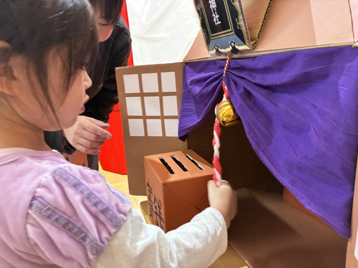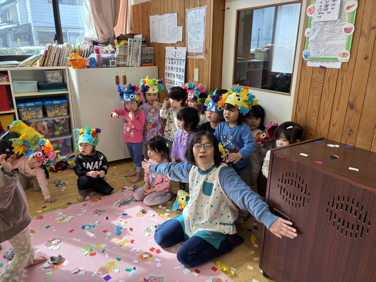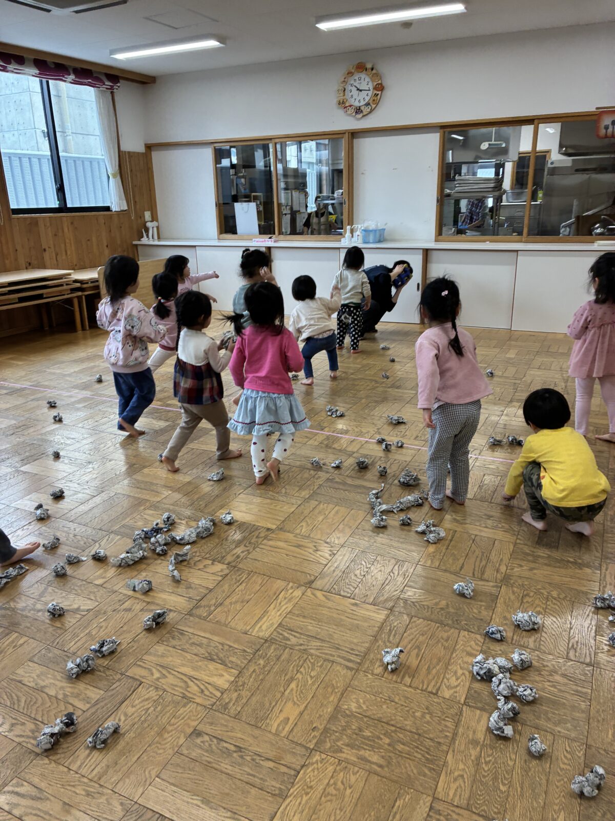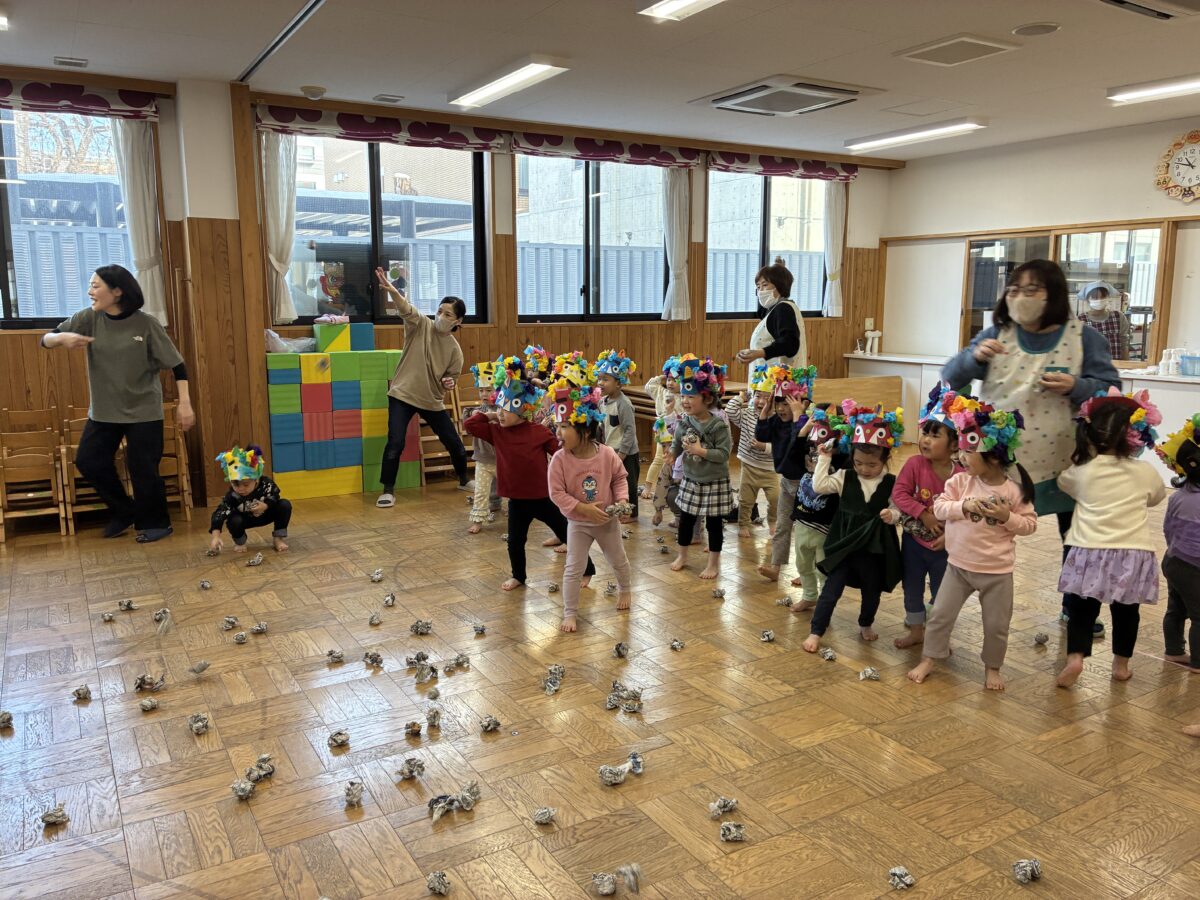 2月3日の節分の日に豆まきをしました。事前に新聞紙を丸めて『まめ』を作成!職員や年長組の子どもたちが鬼役になり、練習をしました。