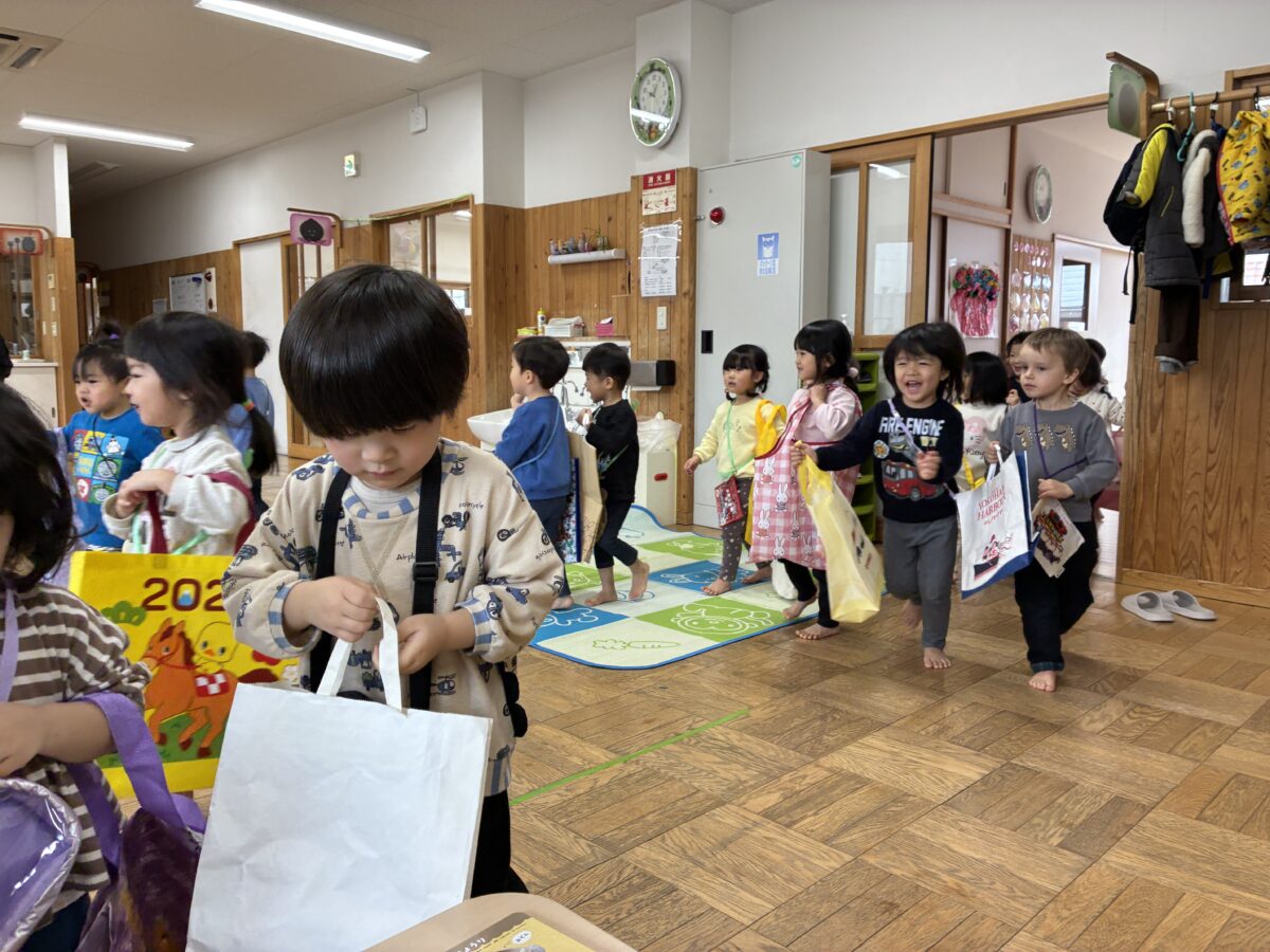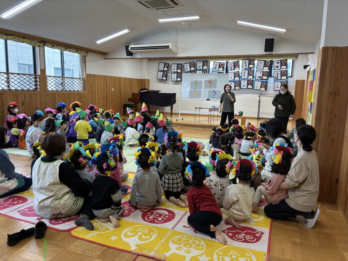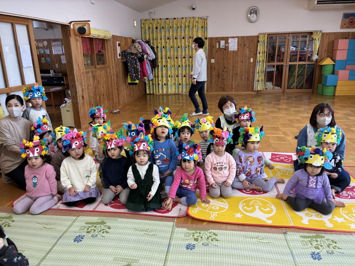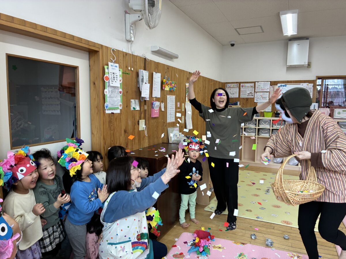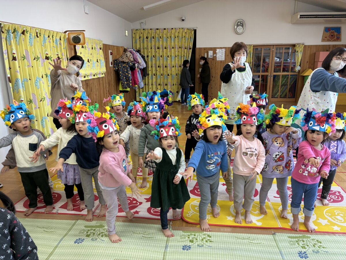 当日は集会にも参加し、歌やダンスを踊って楽しみました。でもでも…本物の鬼はやっぱり怖くて泣いたり逃げてしまう子がほとんどでしたが、それでも豆を一度は投げることができた子もたくさんいましたよ~