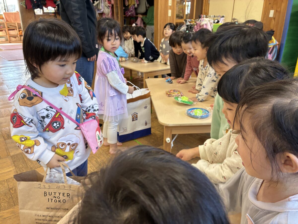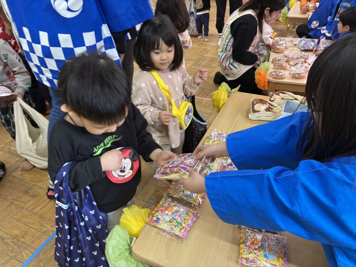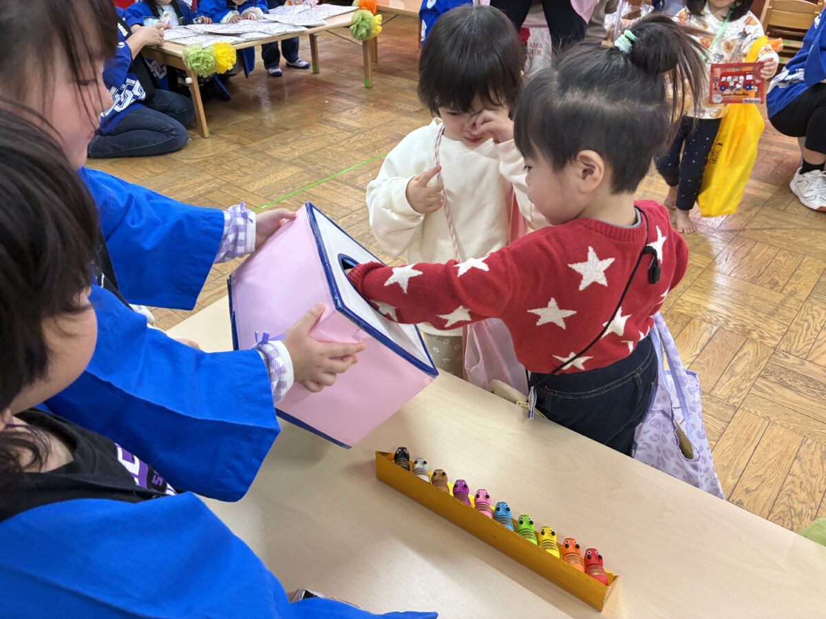 年中組の子どもたちがお店屋さんになってくれて、お買い物ごっこを楽しみました。