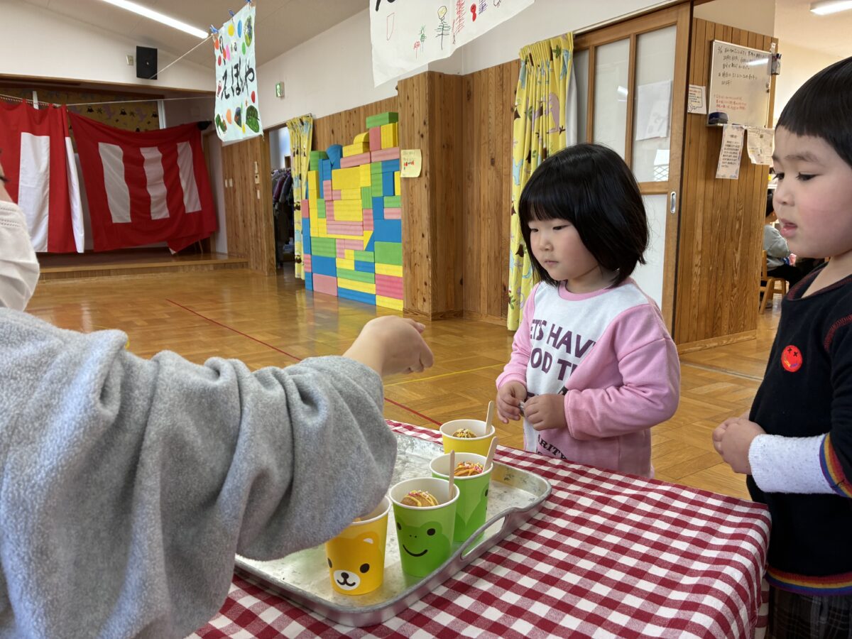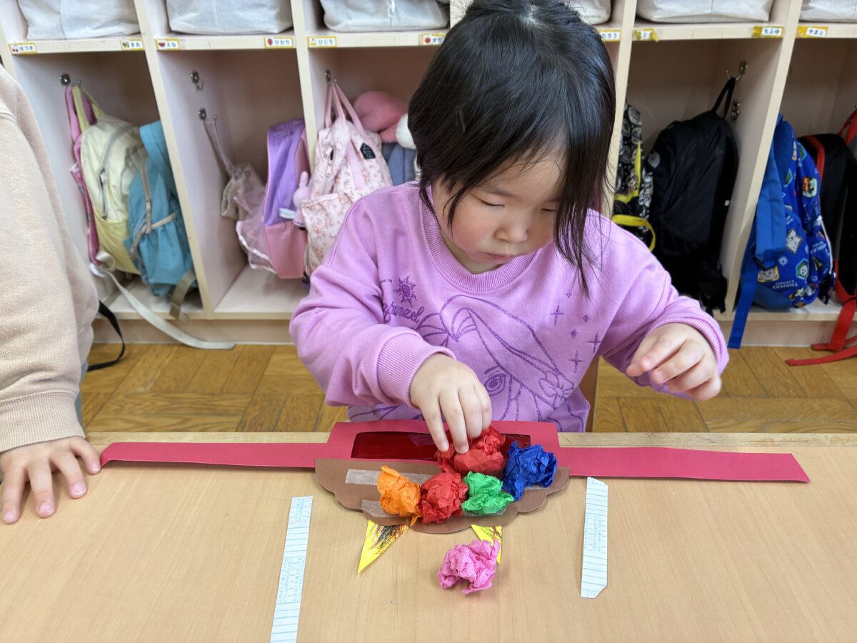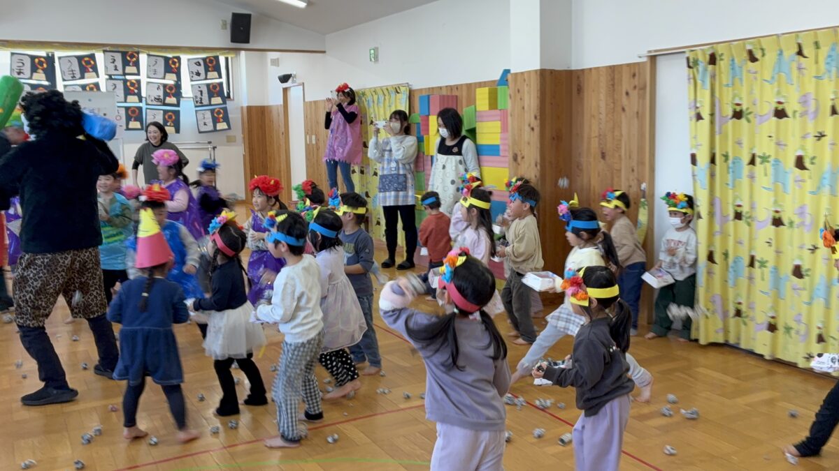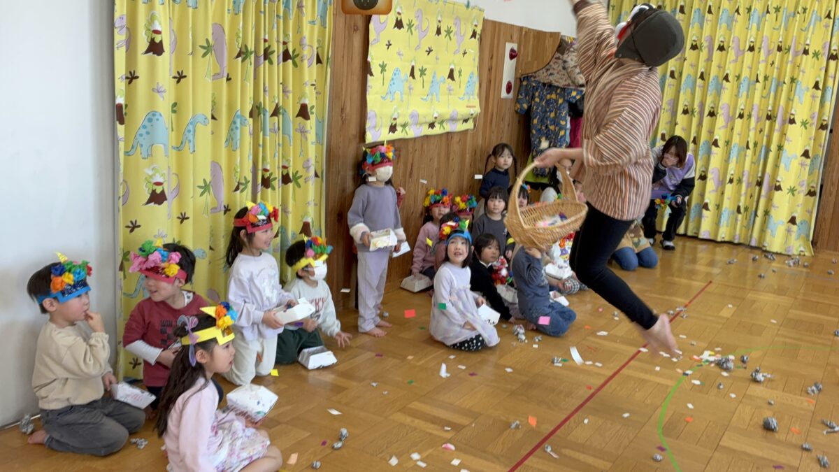 2月3日は節分がありました。自分の中に入っている鬼はどんな鬼かな”怒りんぼ鬼””泣き虫鬼”かなと考えながら、自分で作った鬼のお面を身に着けながら集会に参加しました。集会では、いつ鬼が出てくるのだろうとドキドキ、ワクワクの子どもたち。いざ鬼が出てくると保育者の後ろに隠れる子どもも。豆を必死に投げながら鬼退治が出来ました。