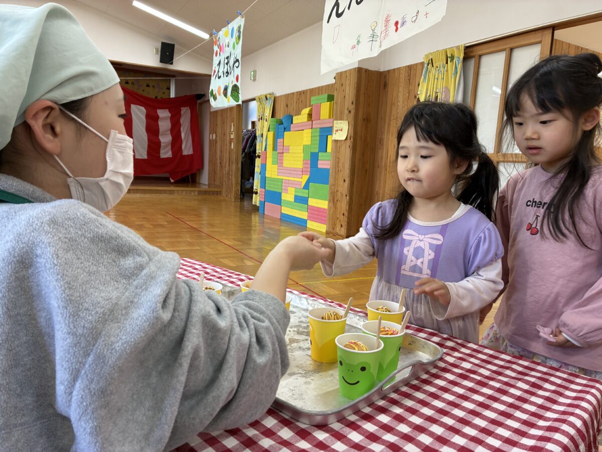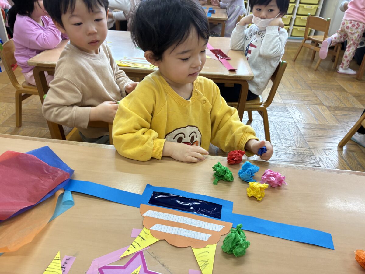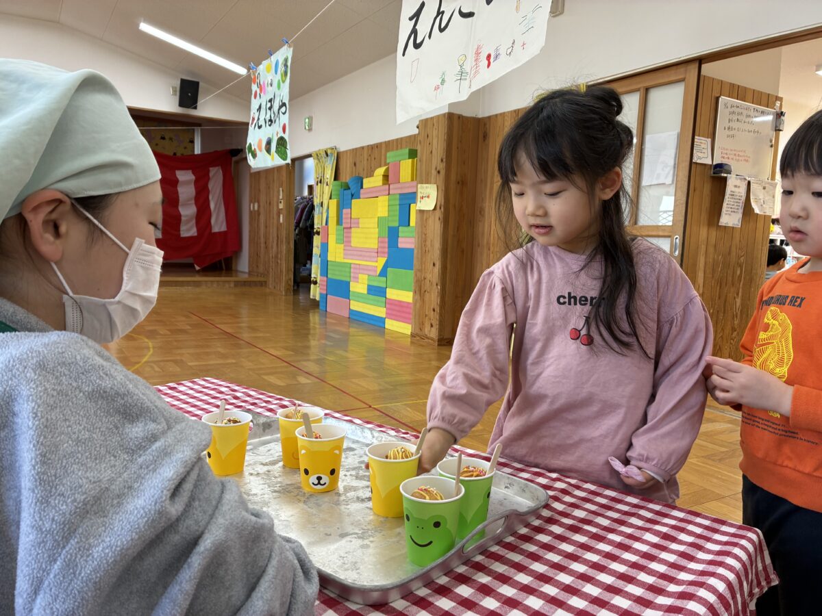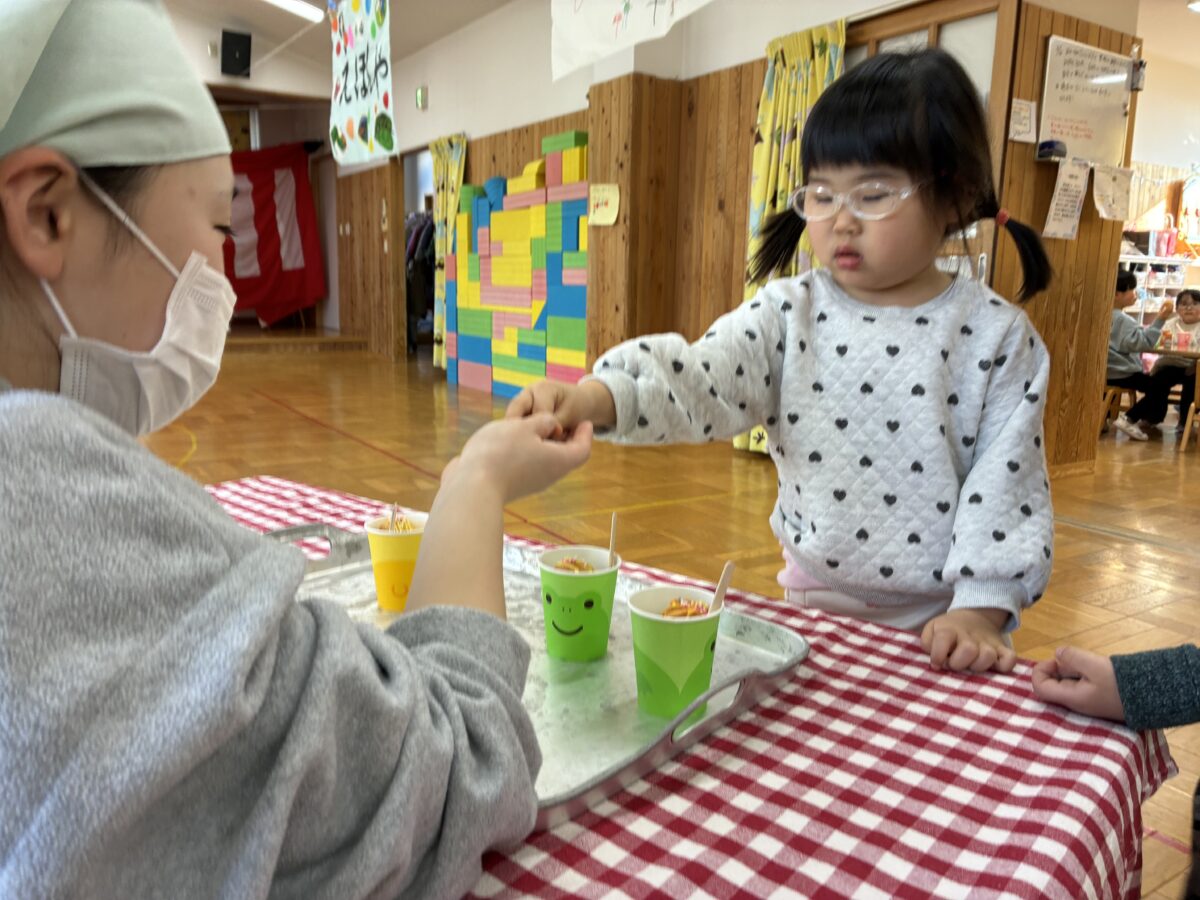2月3日は節分がありました。自分の中に入っている鬼はどんな鬼かな”怒りんぼ鬼””泣き虫鬼”かなと考えながら、自分で作った鬼のお面を身に着けながら集会に参加しました。集会では、いつ鬼が出てくるのだろうとドキドキ、ワクワクの子どもたち。いざ鬼が出てくると保育者の後ろに隠れる子どもも。豆を必死に投げながら鬼退治が出来ました。