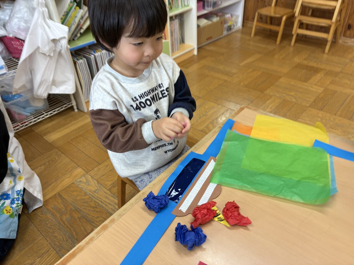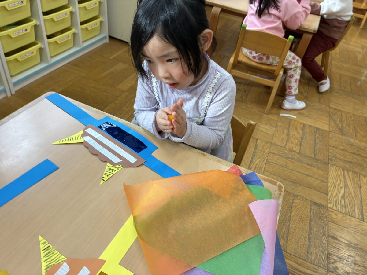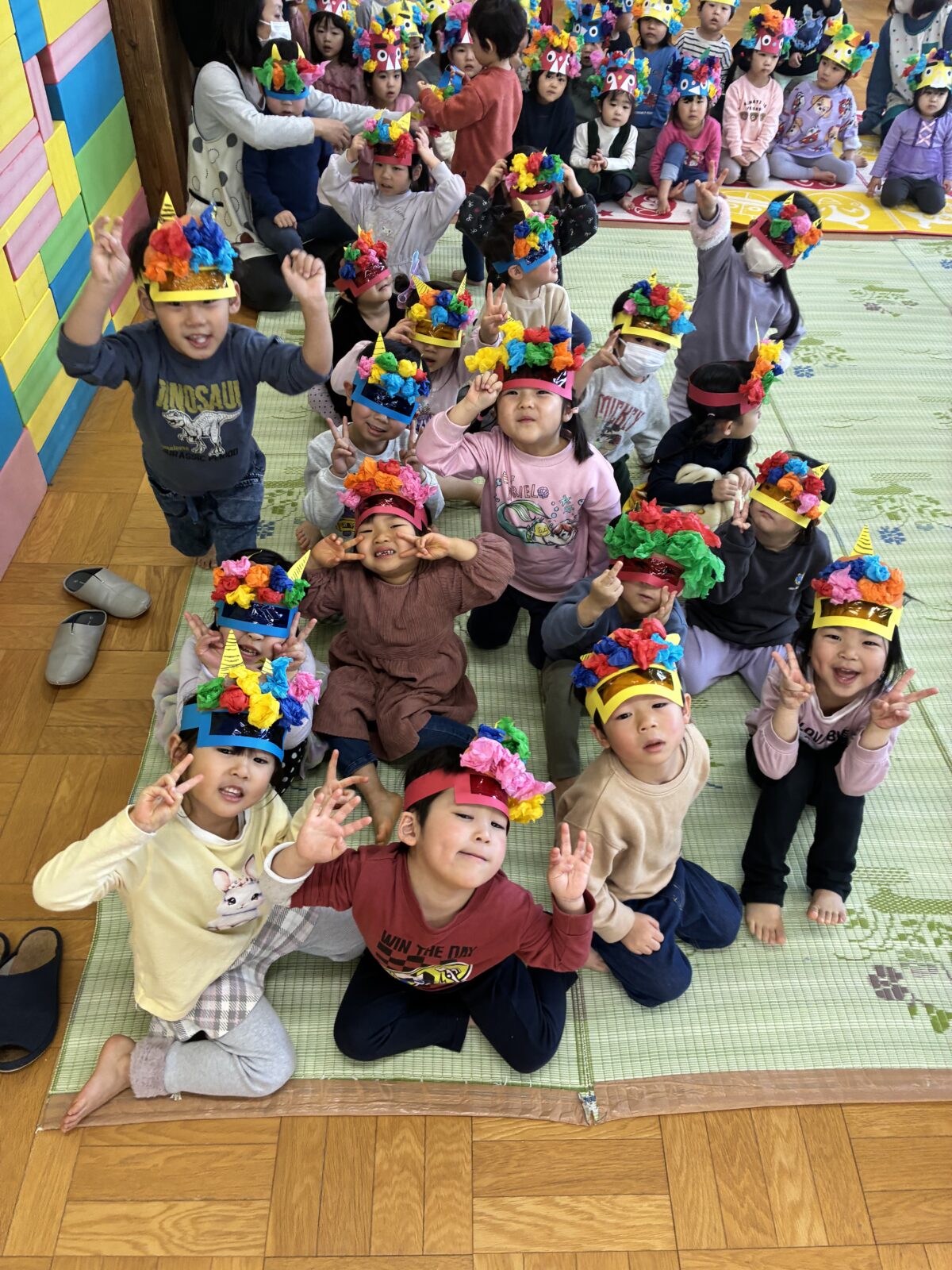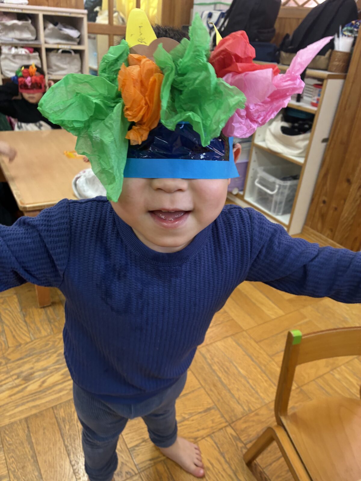 2月3日は節分がありました。自分の中に入っている鬼はどんな鬼かな”怒りんぼ鬼””泣き虫鬼”かなと考えながら、自分で作った鬼のお面を身に着けながら集会に参加しました。集会では、いつ鬼が出てくるのだろうとドキドキ、ワクワクの子どもたち。いざ鬼が出てくると保育者の後ろに隠れる子どもも。豆を必死に投げながら鬼退治が出来ました。
