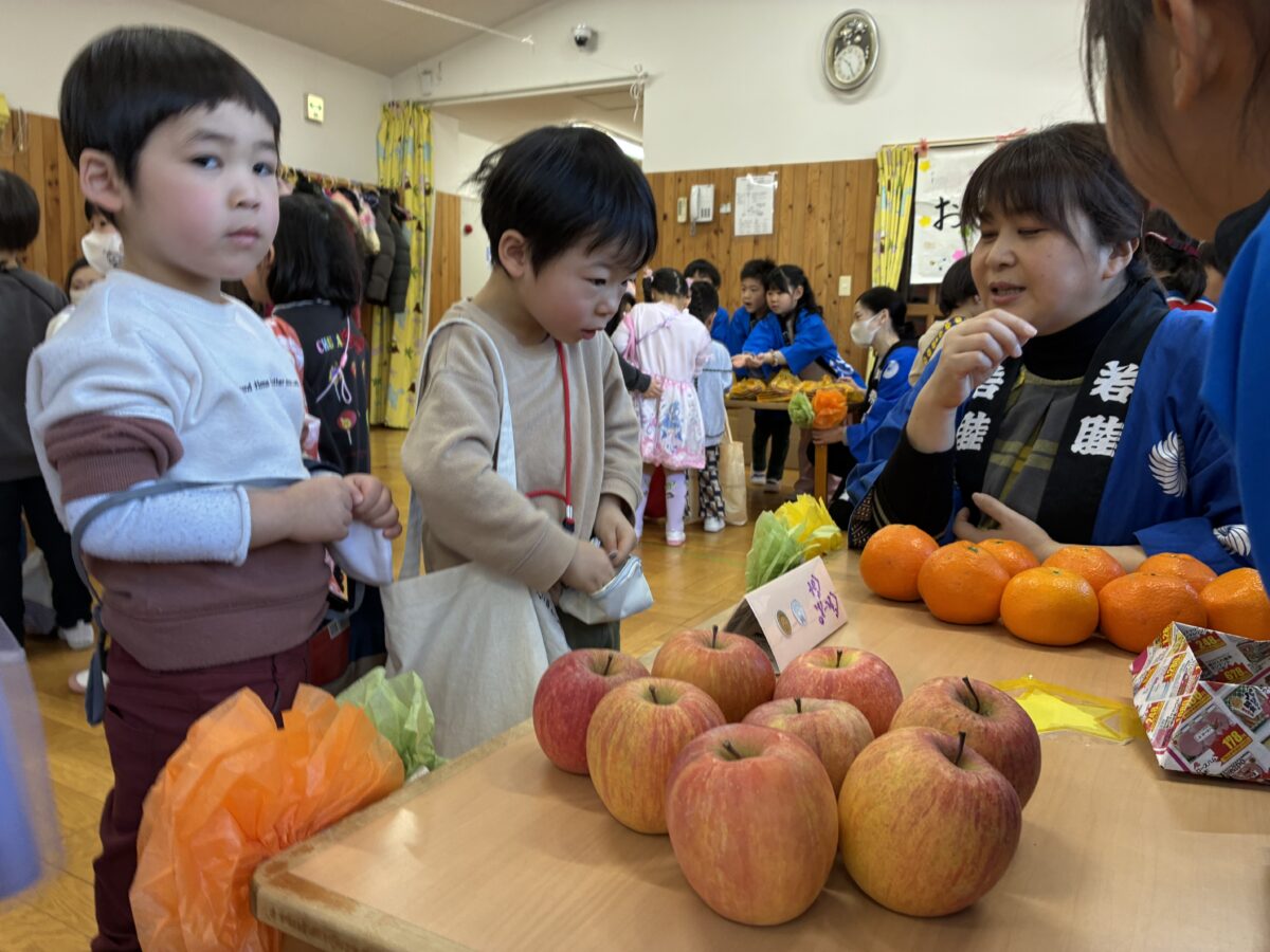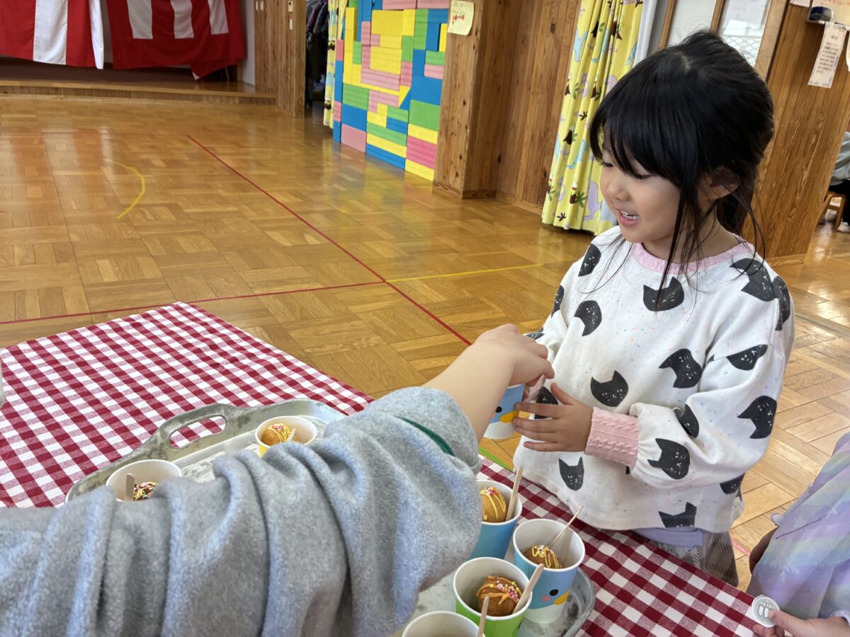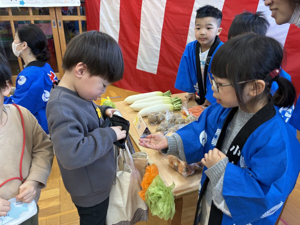 お買い物ごっこに参加しました。レモン組になり初めてお金を使って買い物に挑戦しました。10円玉と100円玉はお金の色が違うという変化に気が付き、値段表と見比べながらお金の枚数を確認してお買い物をすることが出来ました。