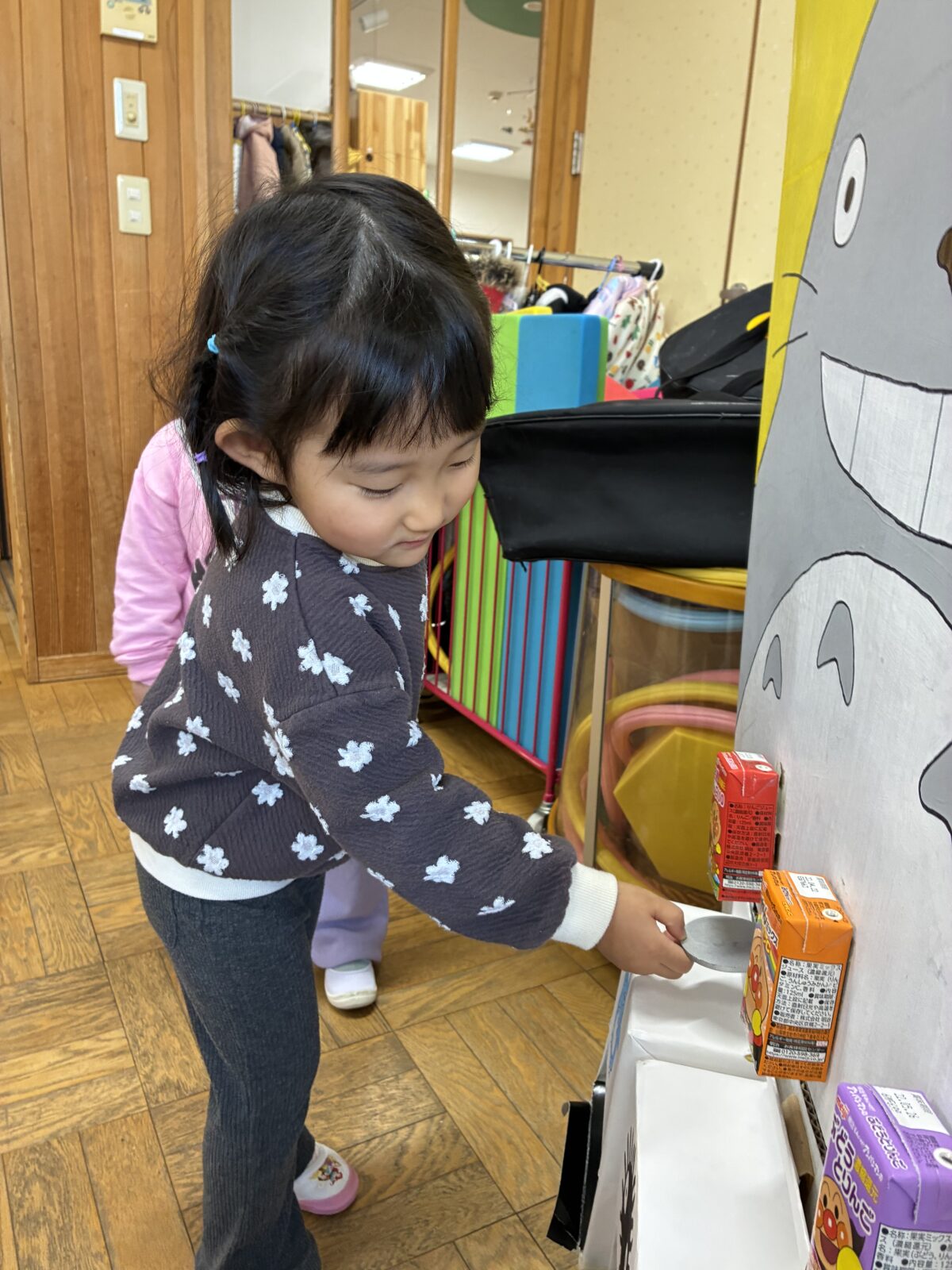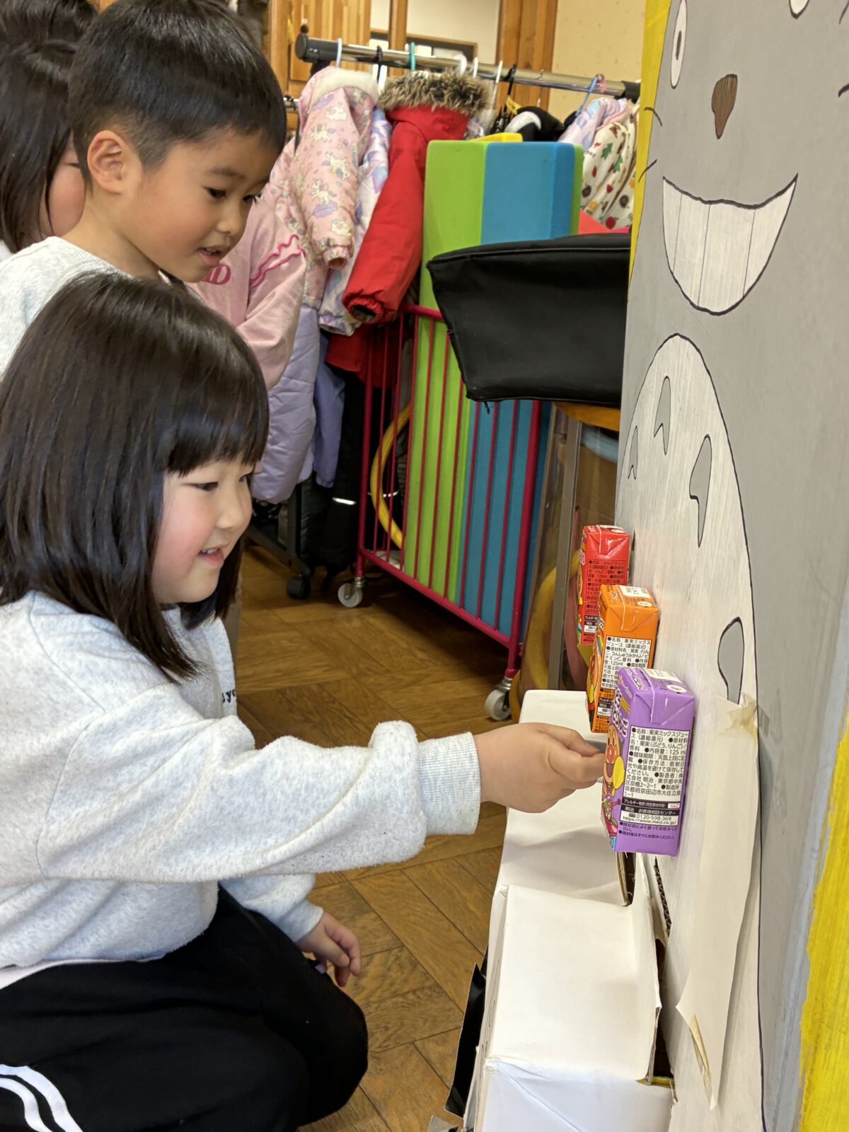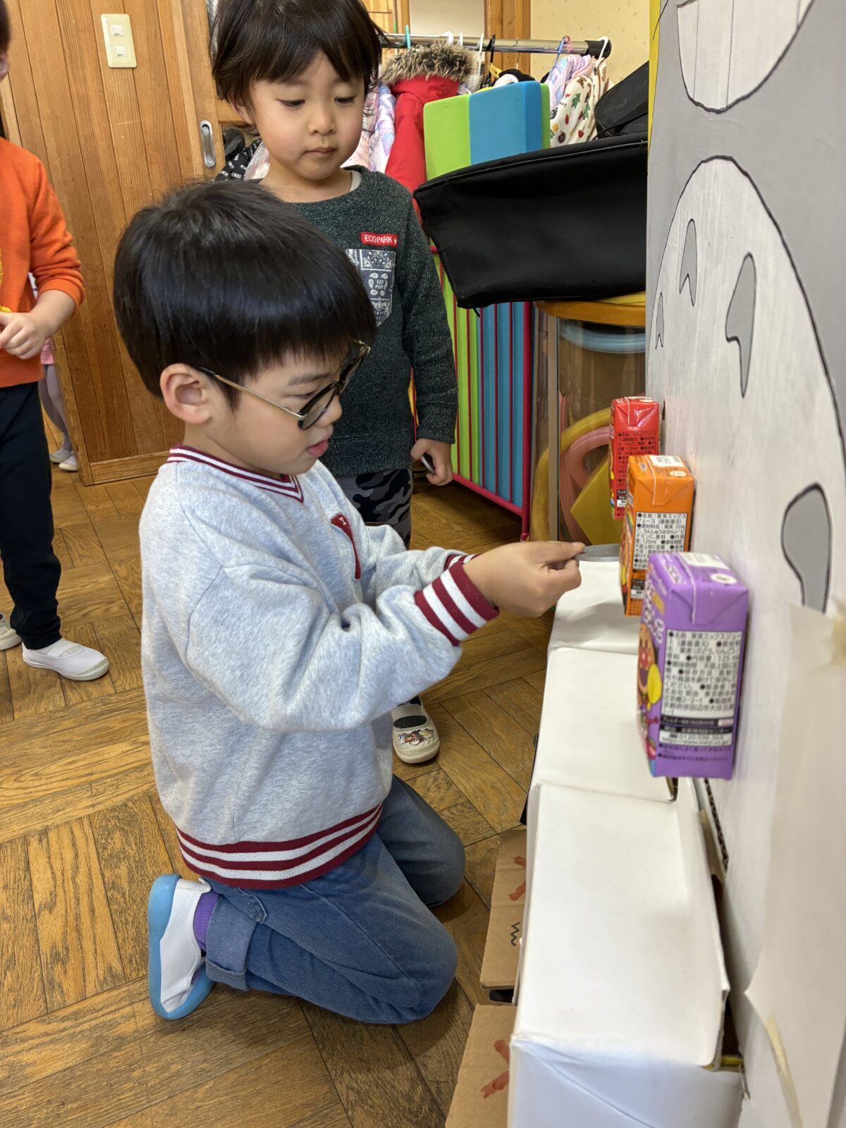お買い物ごっこに参加しました。レモン組になり初めてお金を使って買い物に挑戦しました。10円玉と100円玉はお金の色が違うという変化に気が付き、値段表と見比べながらお金の枚数を確認してお買い物をすることが出来ました。