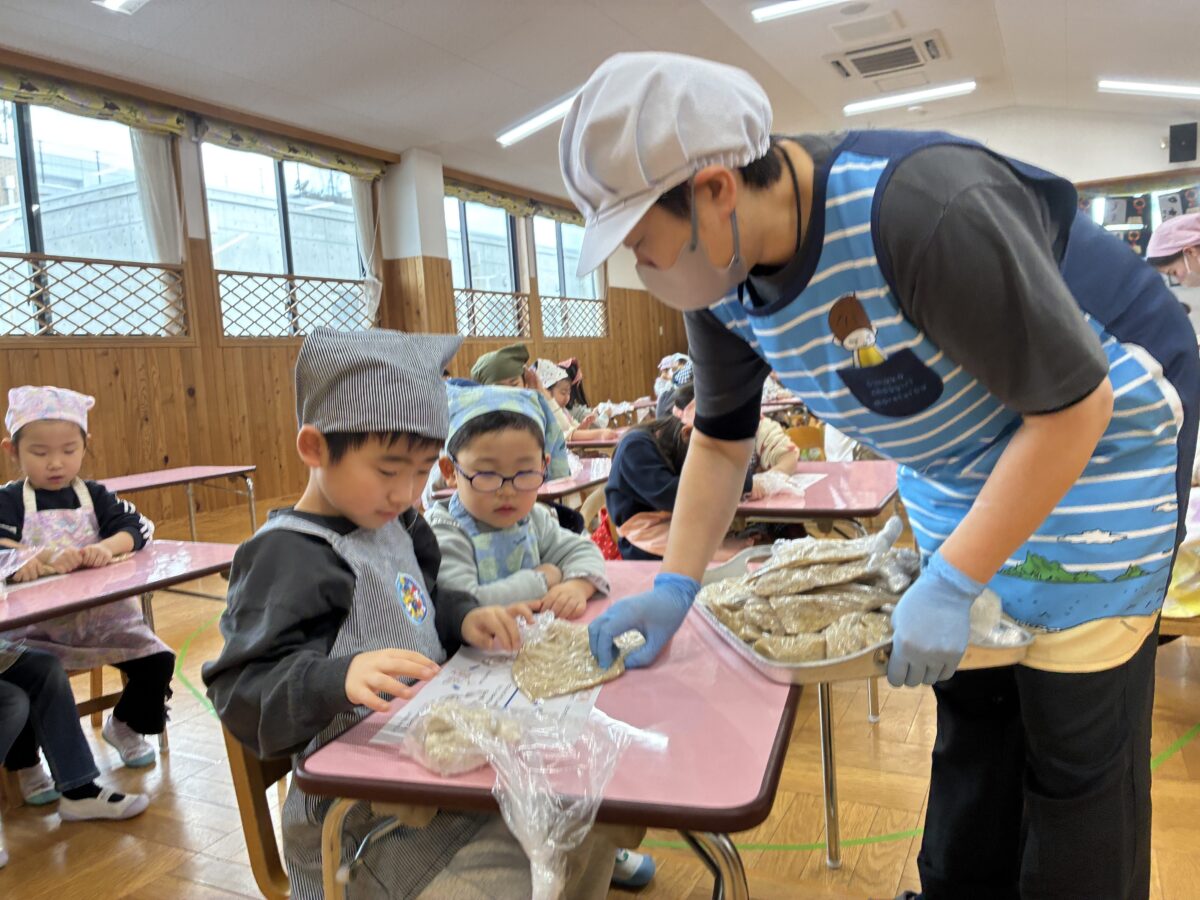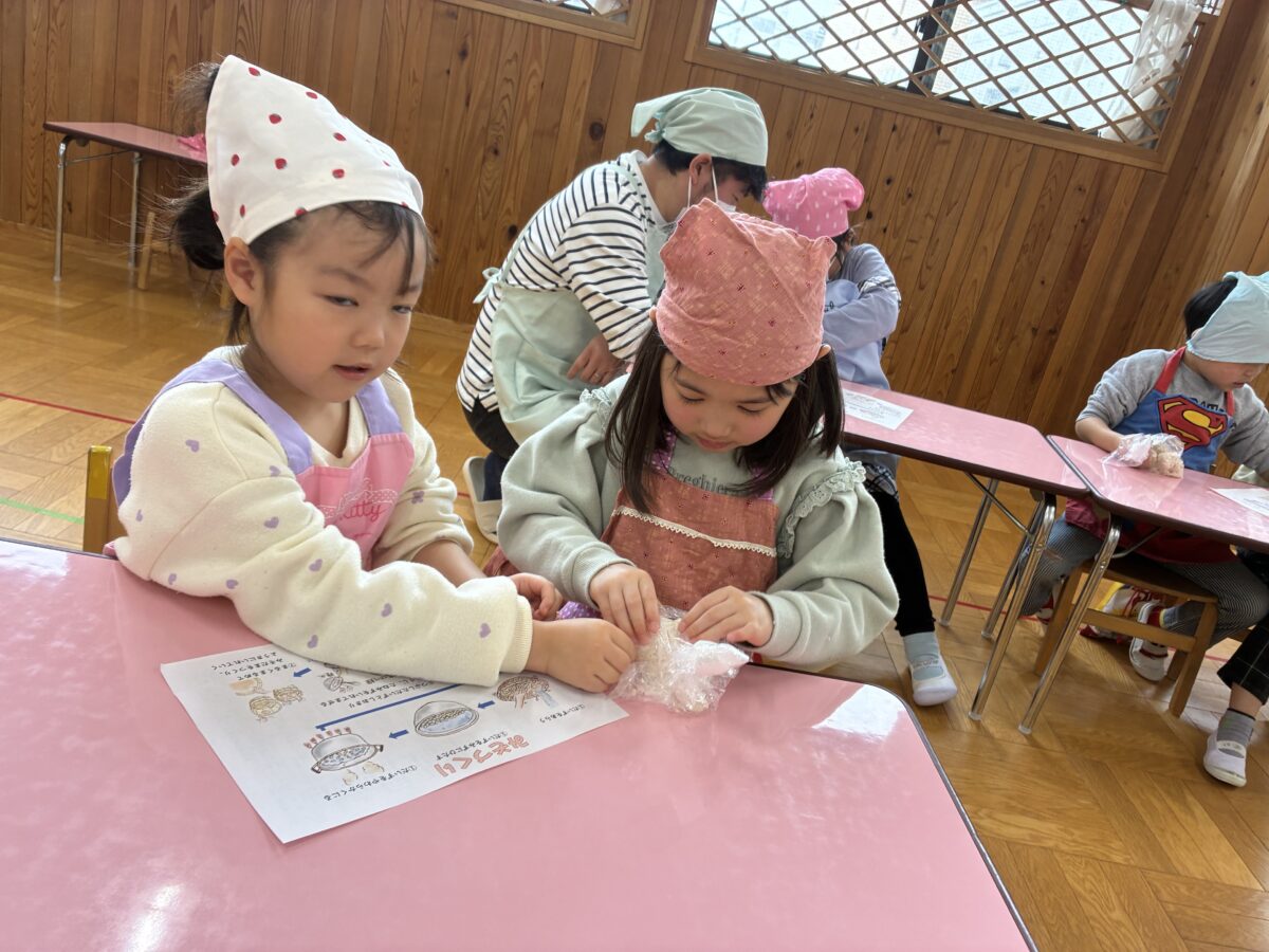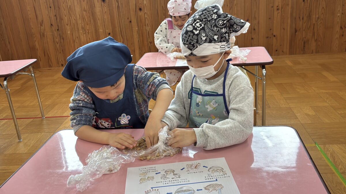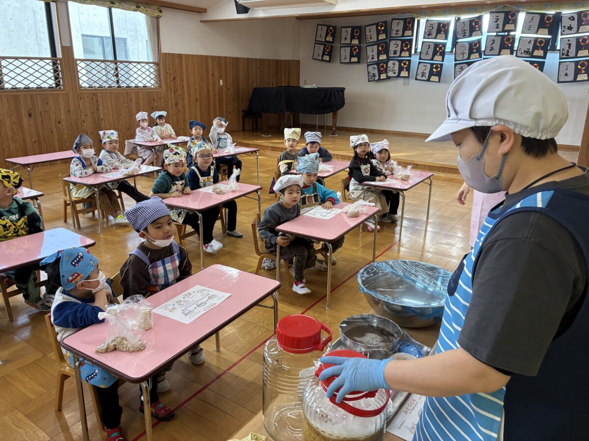 味噌づくりの活動では、柔らかくなった大豆を丁寧につぶし塩と麹を混ぜ合わせる工程も楽しんで取り組みました。「おいしくなーれ」と気持ちを込めて仕込んだみそ。普段何気なく口にしているみそ汁が、沢山の手間と時間をかけて作られていることを、体験を通して感じることができました。