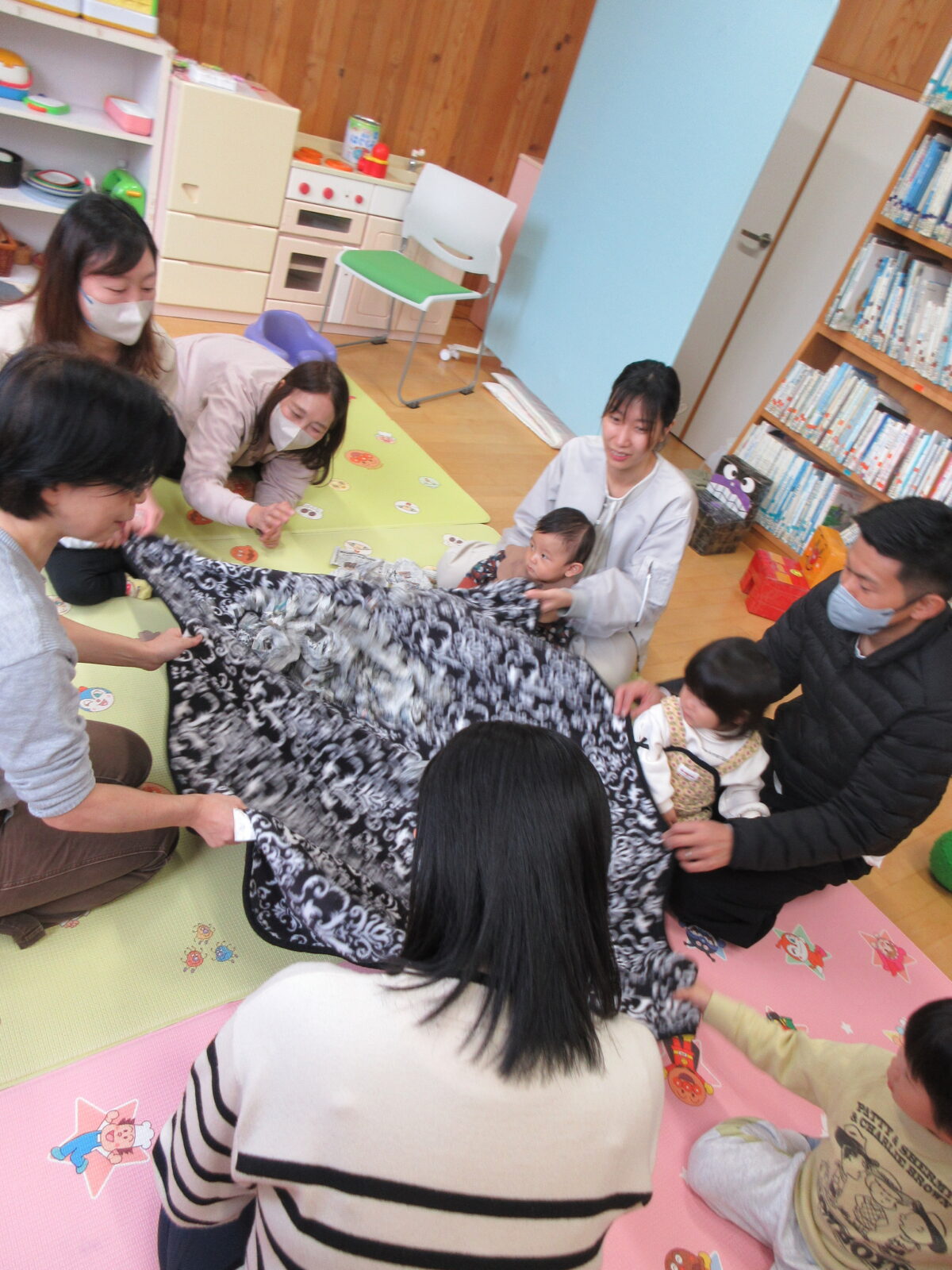 11月13日にLABO PARTYがありました。参加人数も多く、音楽もノリノリで、子どもたちも声を出しながら盛り上がってくれました。今回で10回目ということもあり、何度も参加してくれているお子さんは「あっ、〇○だ!!」と楽しそうにしていました。月齢が低くて楽しめるか心配だったというお家の方でも、おさるの人形や小さな小鳥が出てきたり、大型絵本の英語での読み聞かせもあり、視覚からも楽しめたと、次回の予約も入れてくださいました。12月にはクリスマスのイベントもあるので、ご予約お待ちしていま!!