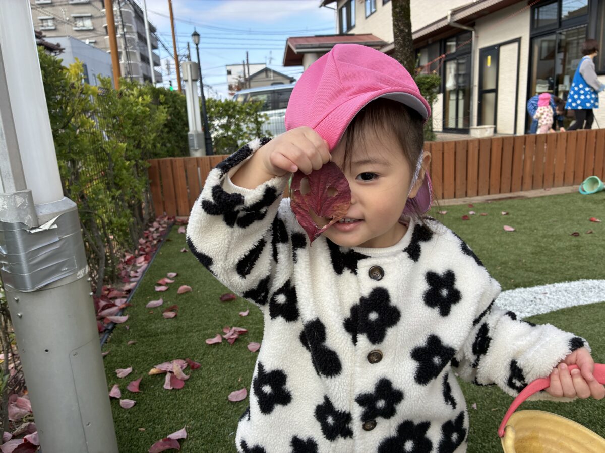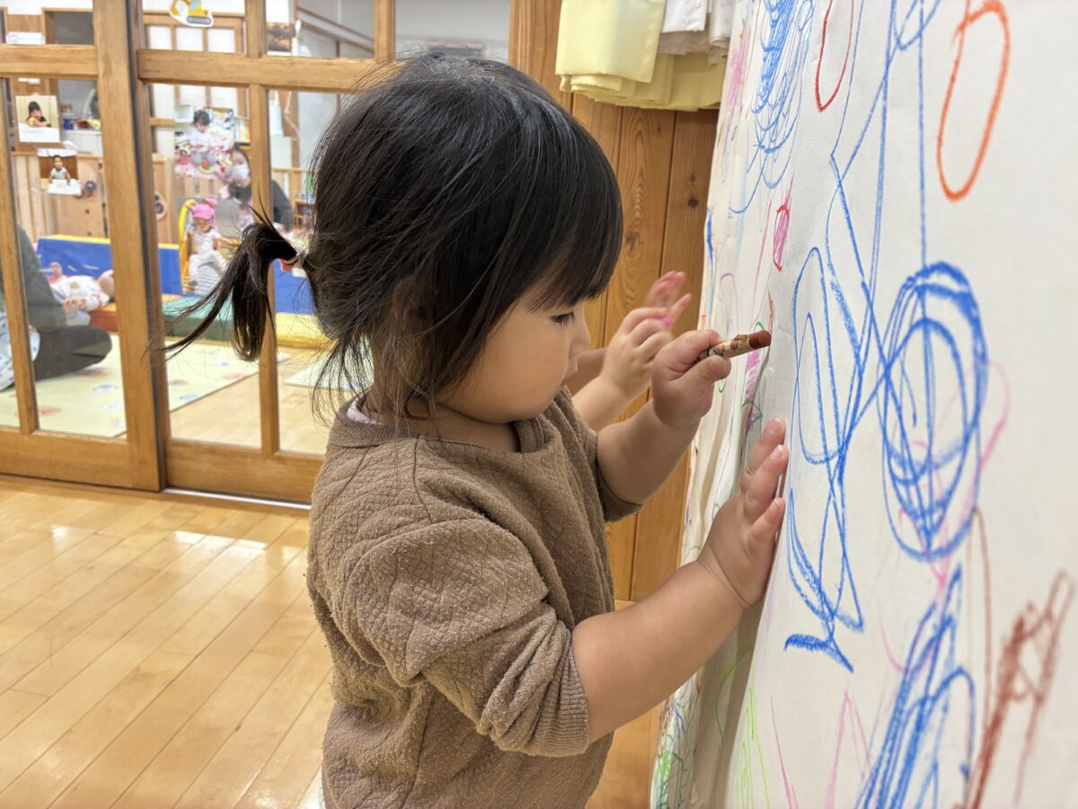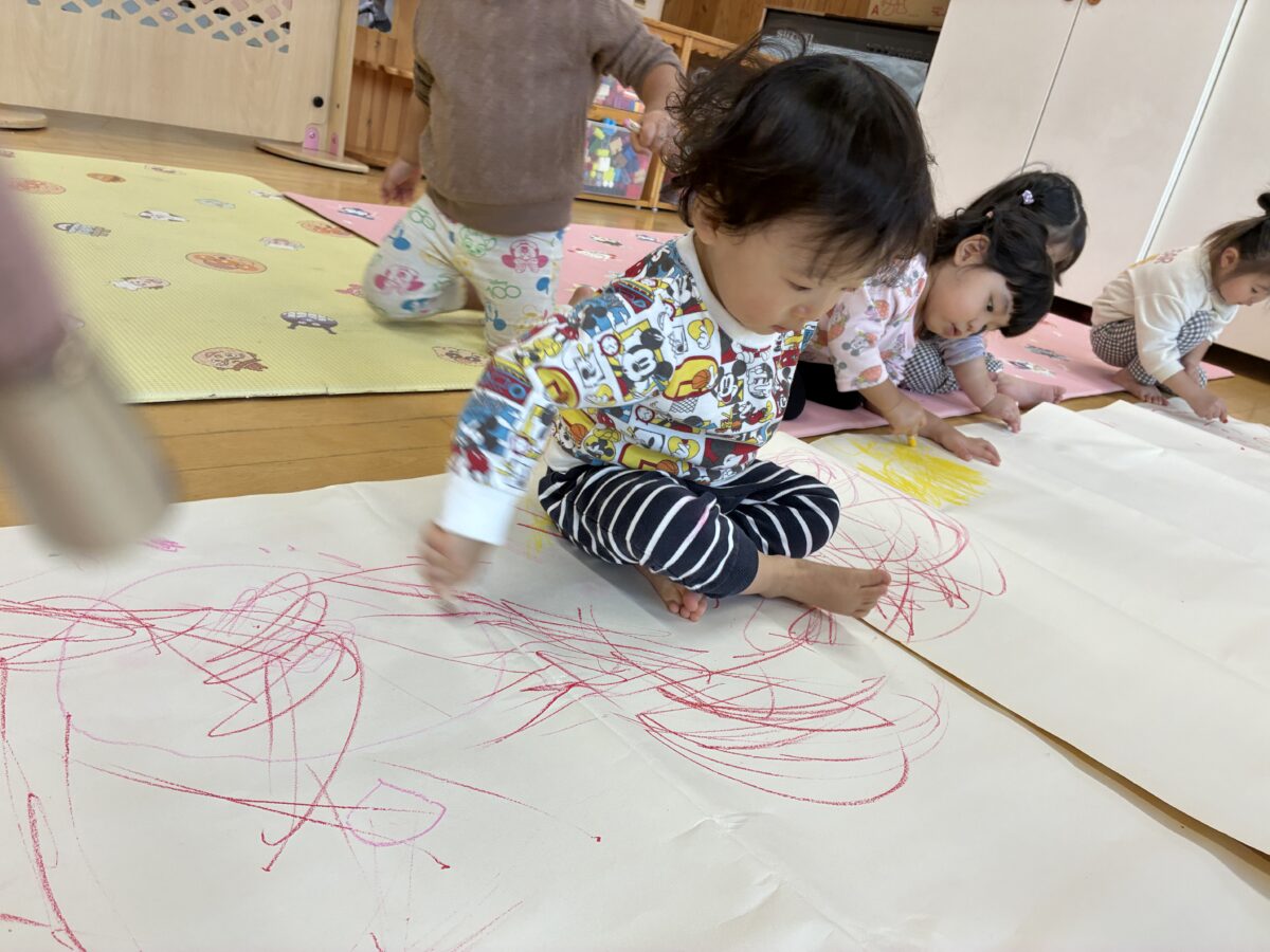 お知らせ NEWS お知らせ ピーチ組 11月の活動日記 2025年12月1日 大きな画用紙にみんなでお絵かき♪ クレヨンで写し出される光景に大喜び。画用紙の上に座り身体全身を使って表現を楽しみました。 出来上がった作品を壁に飾るとまたお絵かき。お友だちとじっくり鑑賞する姿、とてもかわいらしいです。 中庭で落ち葉拾い。色々な色や形の葉っぱを見つけ見せに来てくれました。 暖かい日には野口英世青春広場や神明神社にお散歩。 どんぐりやとんぼなど秋ならではの自然をたくさん感じることができました。 新しい記事へ古い記事へ お知らせ一覧に戻る