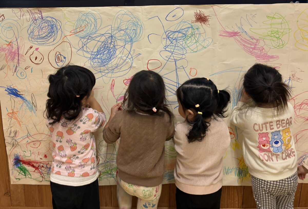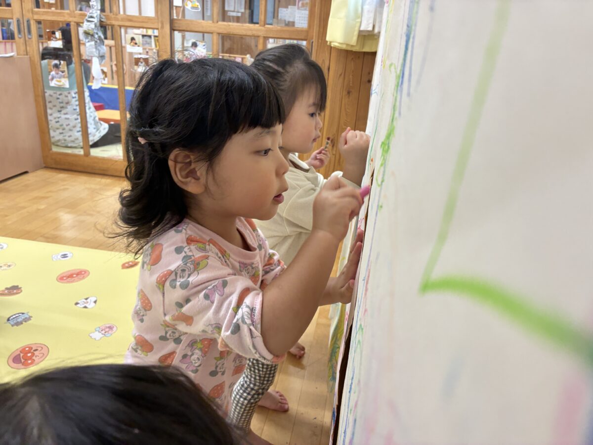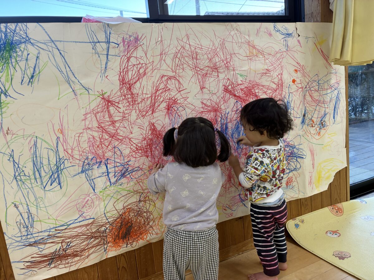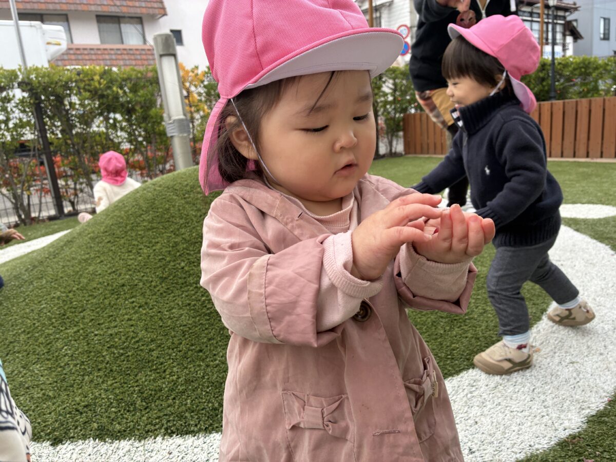 お知らせ NEWS お知らせ ピーチ組 11月の活動日記 2025年12月1日 大きな画用紙にみんなでお絵かき♪ クレヨンで写し出される光景に大喜び。画用紙の上に座り身体全身を使って表現を楽しみました。 出来上がった作品を壁に飾るとまたお絵かき。お友だちとじっくり鑑賞する姿、とてもかわいらしいです。 中庭で落ち葉拾い。色々な色や形の葉っぱを見つけ見せに来てくれました。 暖かい日には野口英世青春広場や神明神社にお散歩。 どんぐりやとんぼなど秋ならではの自然をたくさん感じることができました。 新しい記事へ古い記事へ お知らせ一覧に戻る