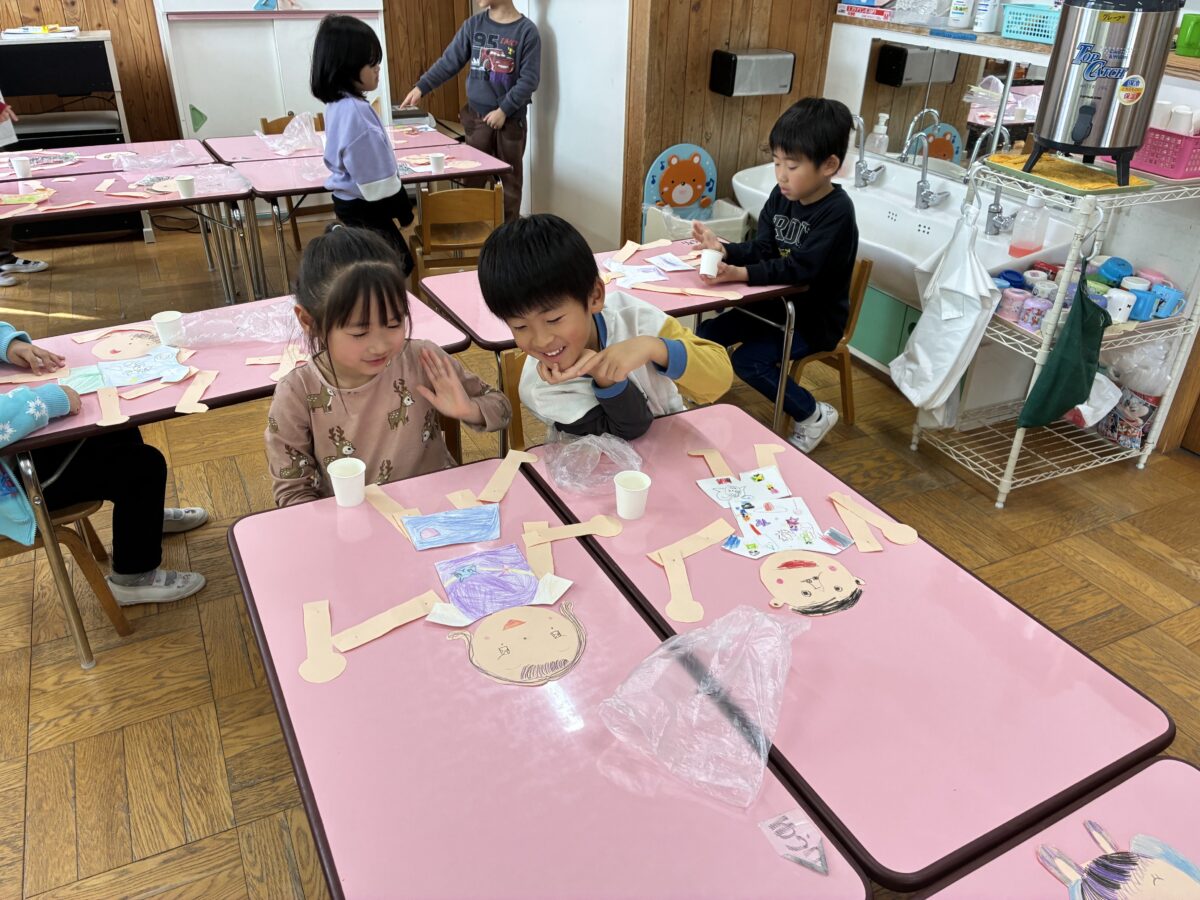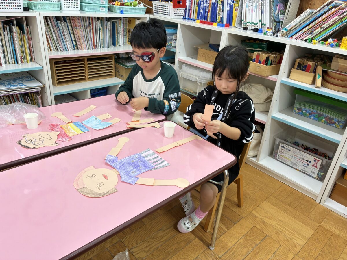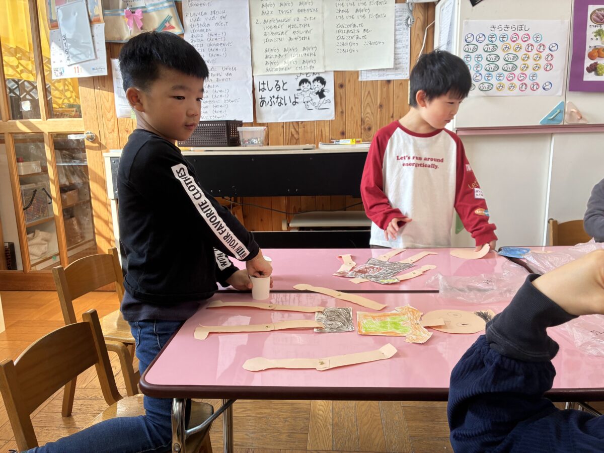 体のしくみへの興味を広げることをねらいとして「関節」についての製作活動をおこないました。体には、“関節”があることで、曲げ伸ばしができ、動くときの大切な役割をしていることを確かめました。