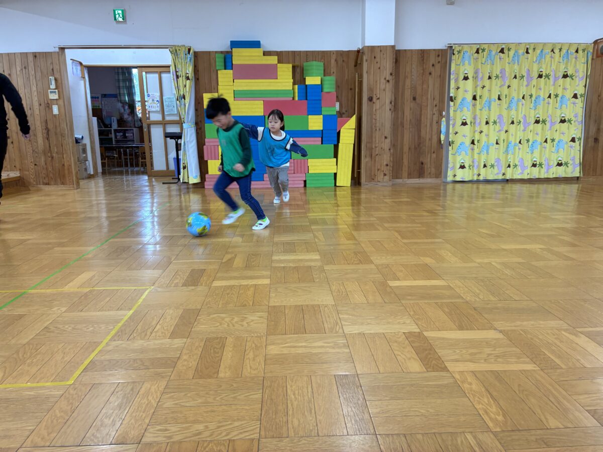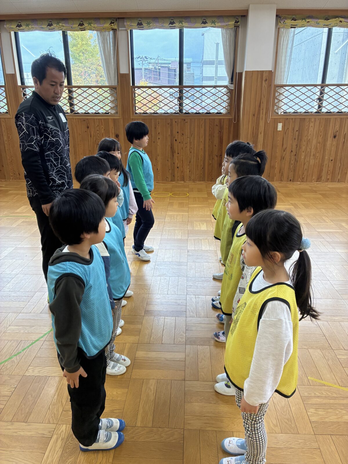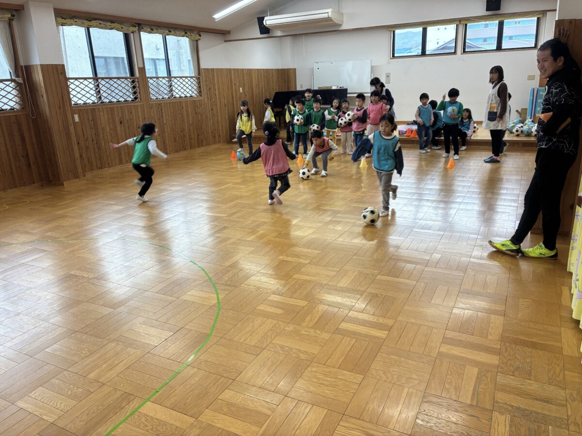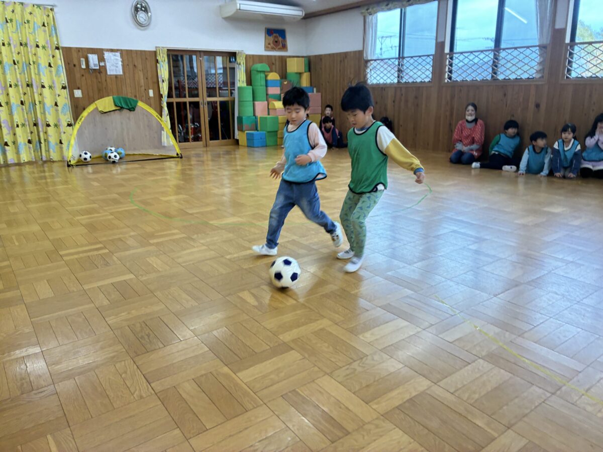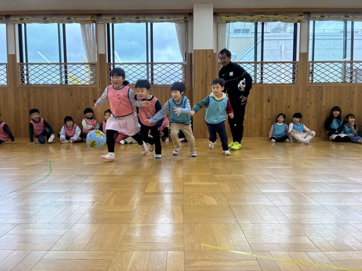 クラブチームのコーチを迎え、2日間のサッカー教室を行いました。1日目は、ボールに親しみながら身体の使い方を楽しむ活動を中心に行いました。2日目はチームに分かれ試合形式に挑戦し、挨拶や並び方など、集団での約束事を意識しながら取り組む姿が見られました。